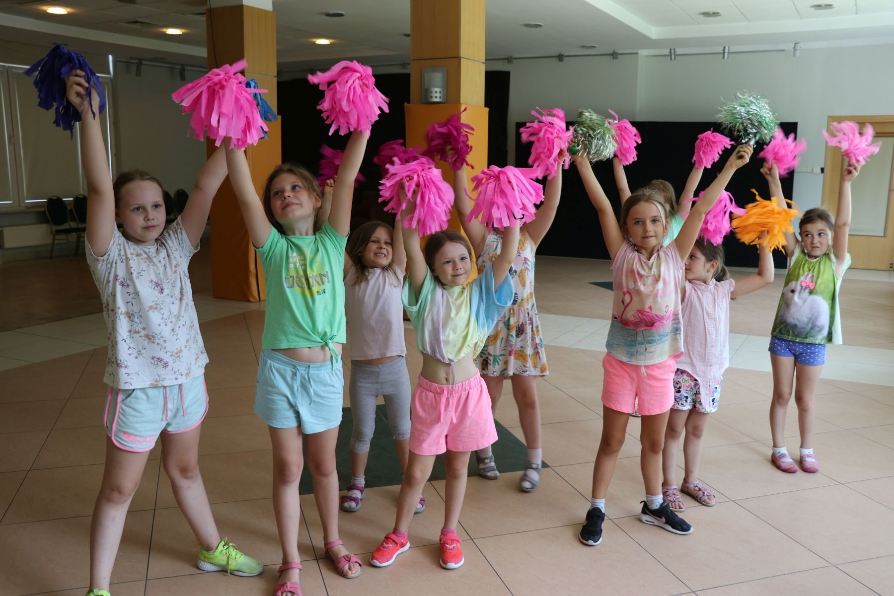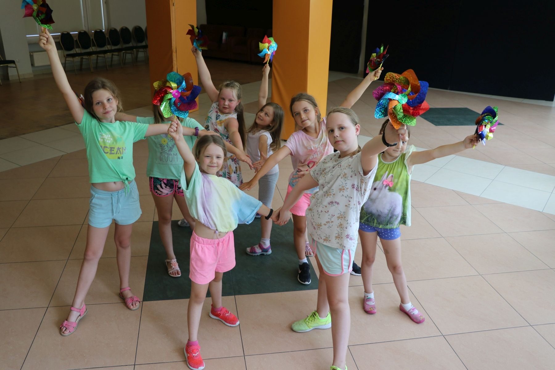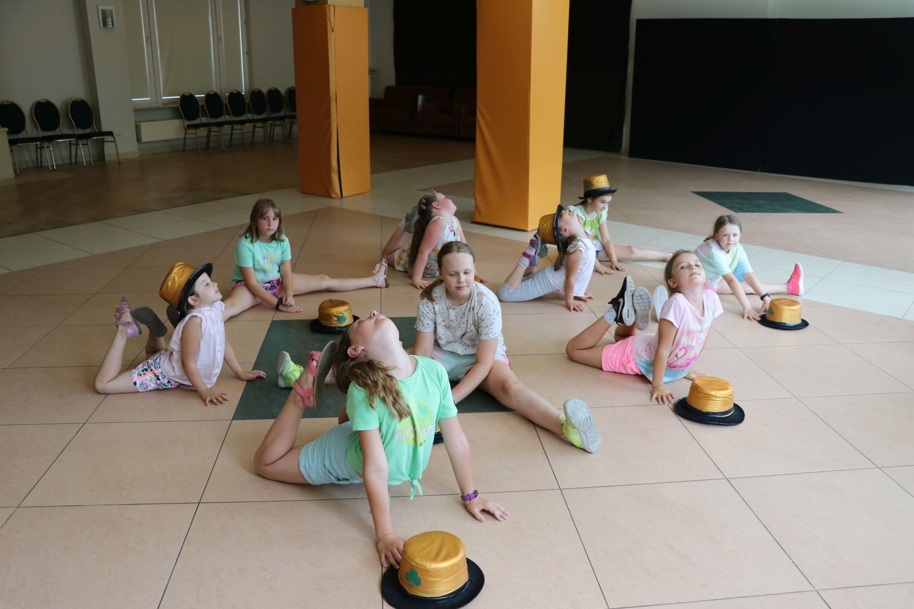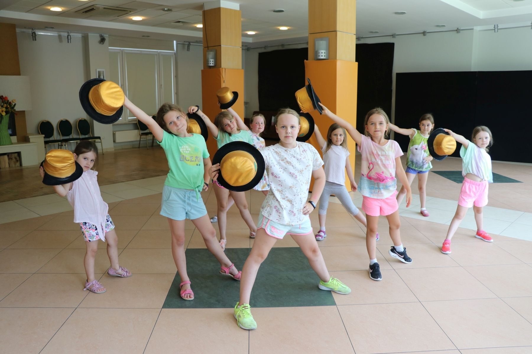 Daliśmy również możliwość skorzystania z zajęć tanecznych, podczas których dzieci stworzyły układ choreograficzny do ich ulubionej, nowoczesnej muzyki. Ćwiczenia poprzedzone były rozgrzewką, a dla uatrakcyjnienia używane były rekwizyty taneczne tj. hula-hop, kapelusze i pompony.