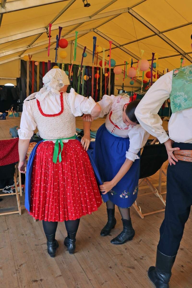 Przez kolejne festiwalowe dni, zespoły występowały gościnnie na scenach Domu Kultury w Starych Babicach (piątek) oraz ponownie na scenie przy hali namiotowej w Ołtarzewie (sobota). Szczególnie drugi koncert w Ołtarzewie był pewnym novum w kalendarzu festiwalu, ponieważ sobota miała upłynąć pod znakiem warsztatowo-integracyjnym. Czy się to udało? Jak najbardziej! Zarówno Demižon, jaki i Klas Horjul po wykonaniu swoich układów scenicznych zaprosili zgromadzoną publiczność do wspólnej zabawy i próby nauki choreografii układów prezentowanych przed chwilą na scenie. Co bardziej śmiali widzowie z chęcią podjęli się wyzwania, a na tych mniej śmiałych podziałały prośby członków zespołów. Efektem tego była wspaniała zabawa czesko-słoweńsko-polska, a całość zwieńczyło grupowe zatańczenie poloneza, prowadzonego przez członków Zespołu Ludowego „Ożarowiacy”.