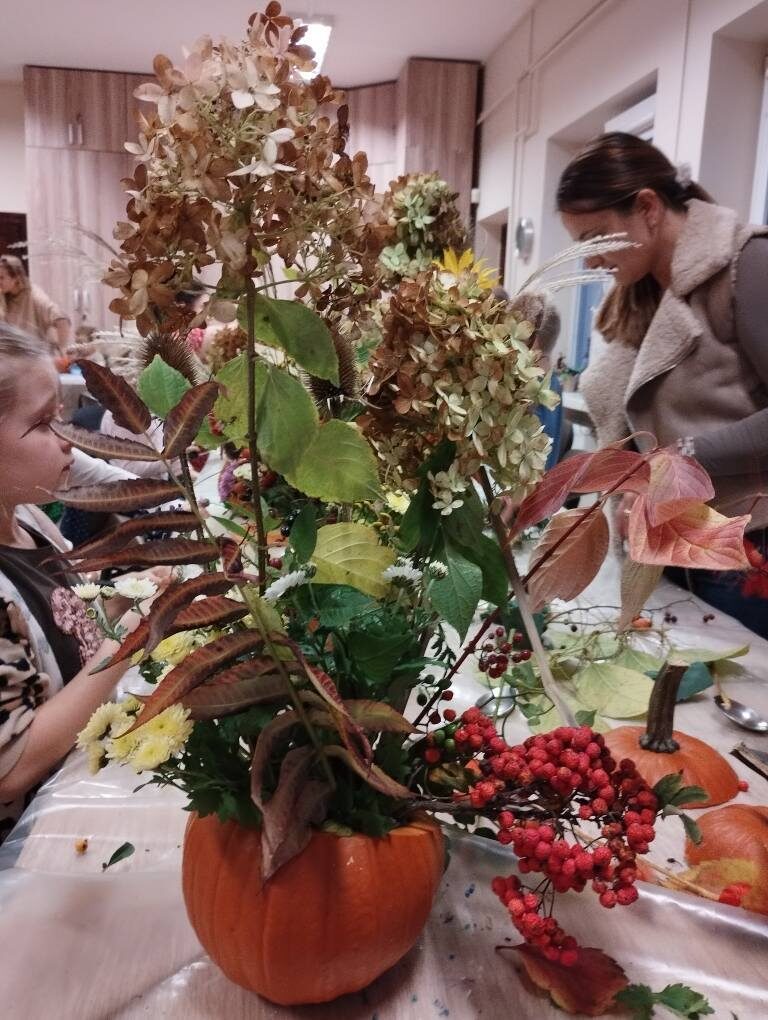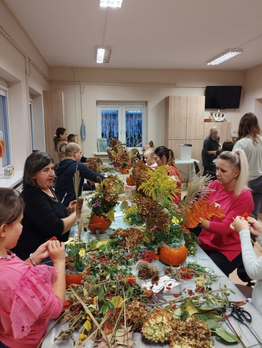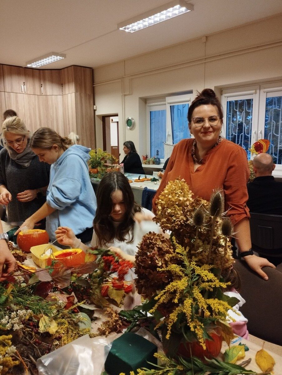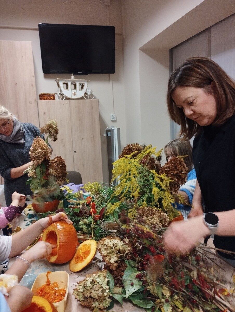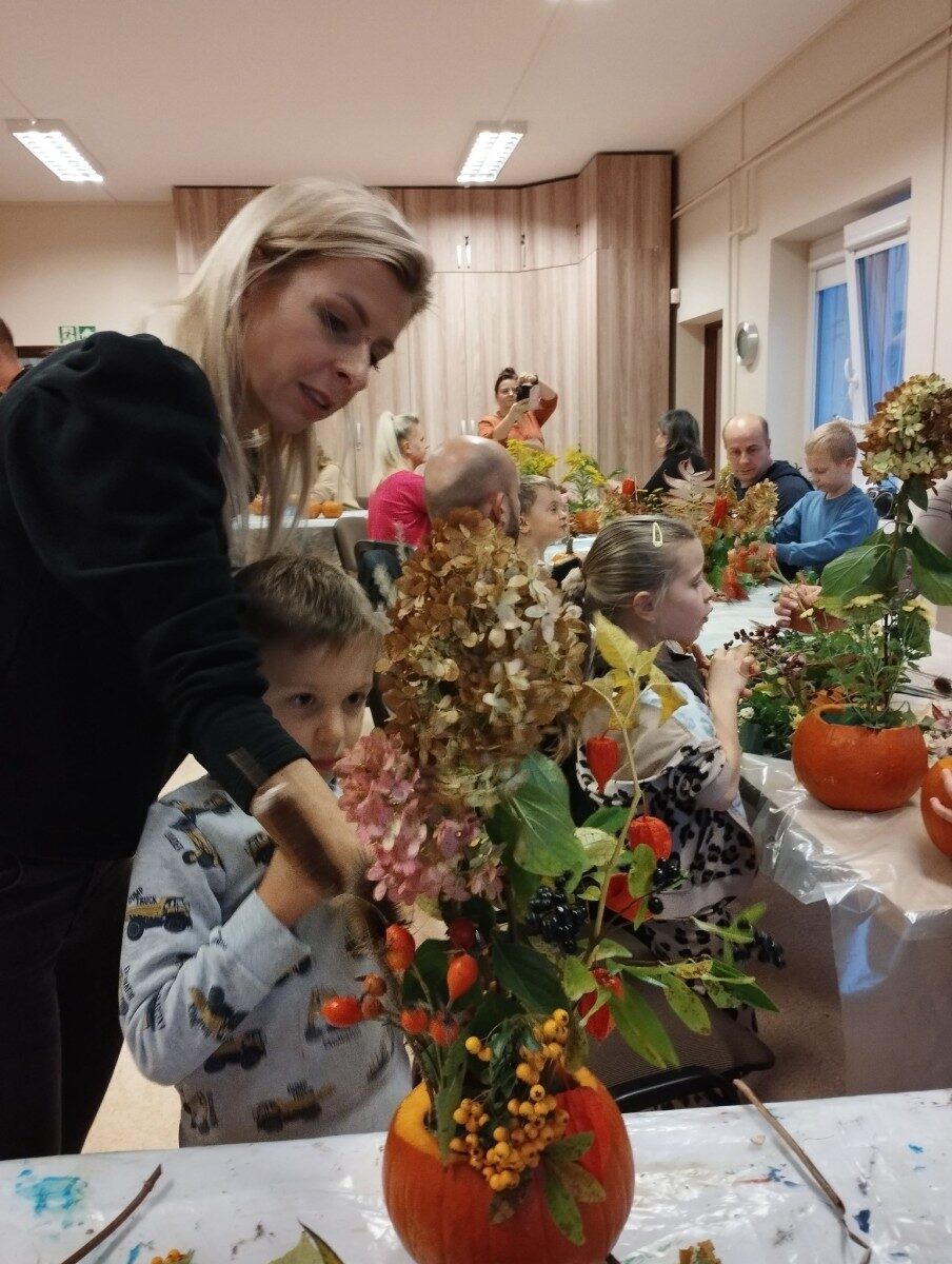 Dynia – królowa jesiennego stołu. Jesień piękna, kolorowa wprost zachwyca. Przecudne dekoracje na stół ” dyniowe wazony” wykonali uczestnicy niedzielnych warsztatów, pod czujnym okiem instruktor Katarzyny Cyniak- Górneckiej  w Filii Bronisze.