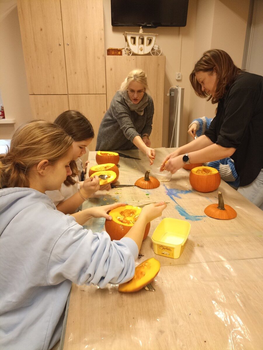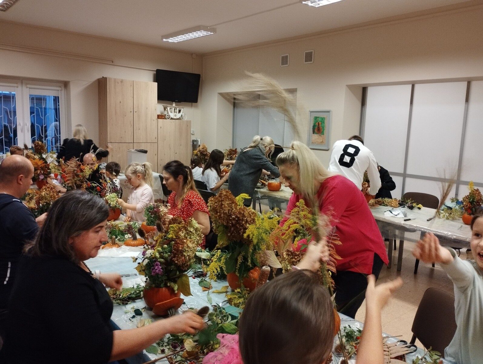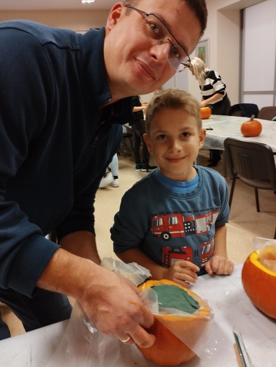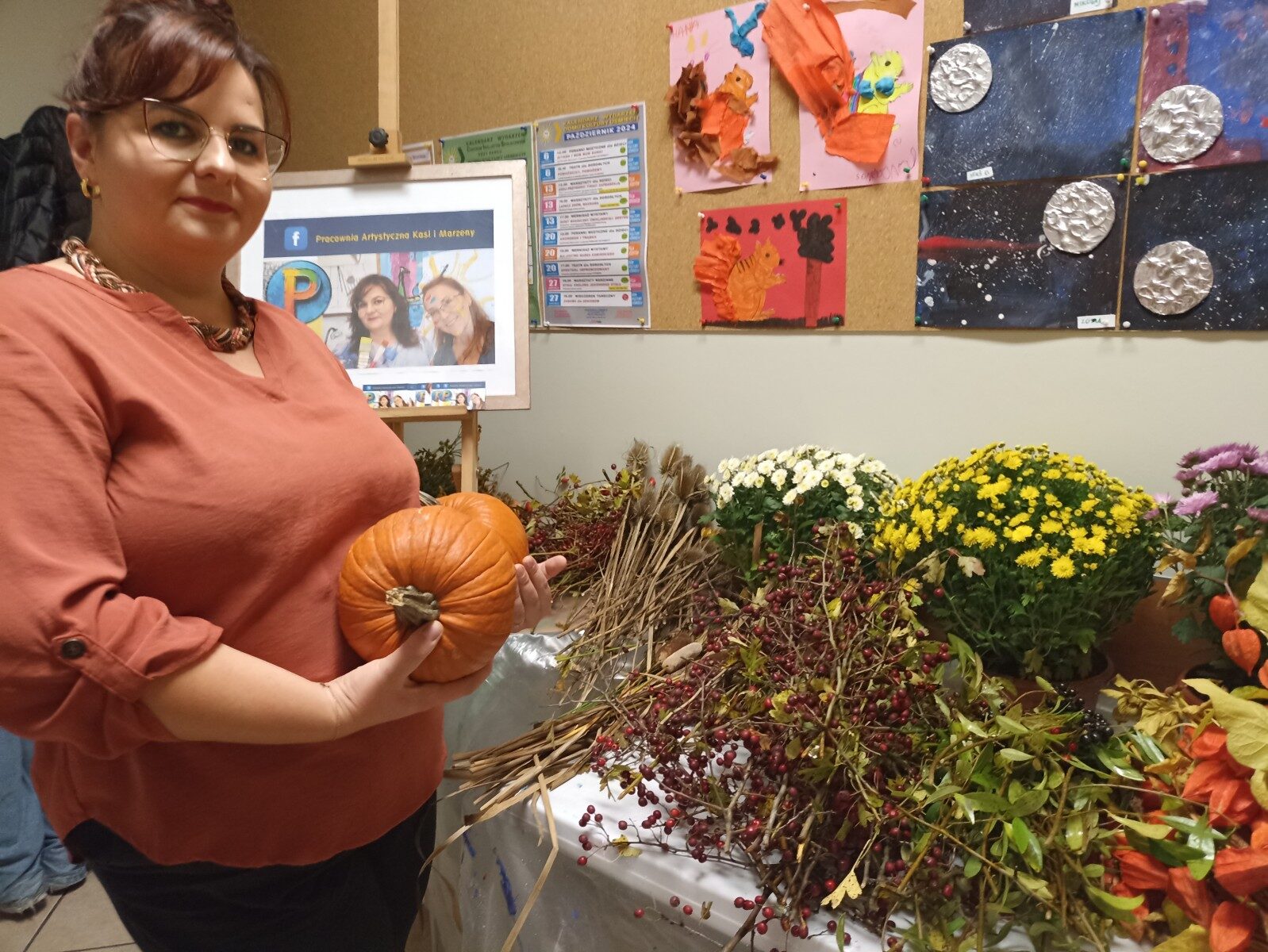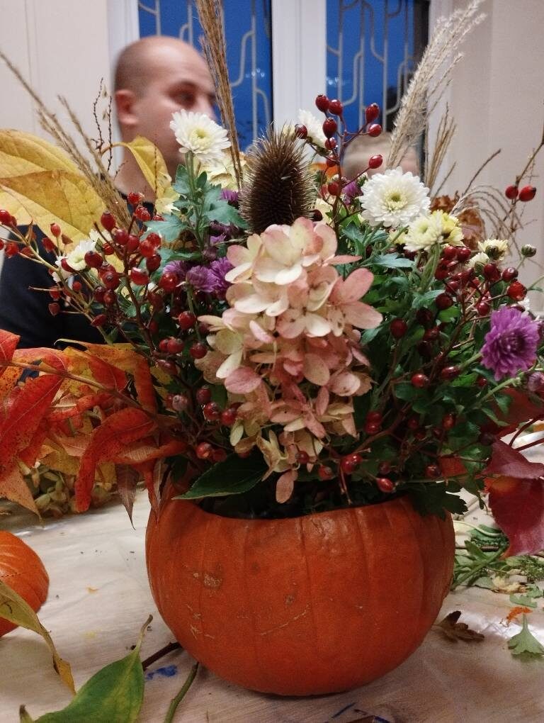 Dynia – królowa jesiennego stołu. Jesień piękna, kolorowa wprost zachwyca. Przecudne dekoracje na stół ” dyniowe wazony” wykonali uczestnicy niedzielnych warsztatów, pod czujnym okiem instruktor Katarzyny Cyniak- Górneckiej  w Filii Bronisze.