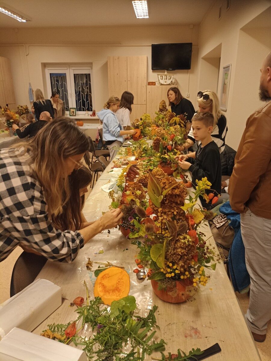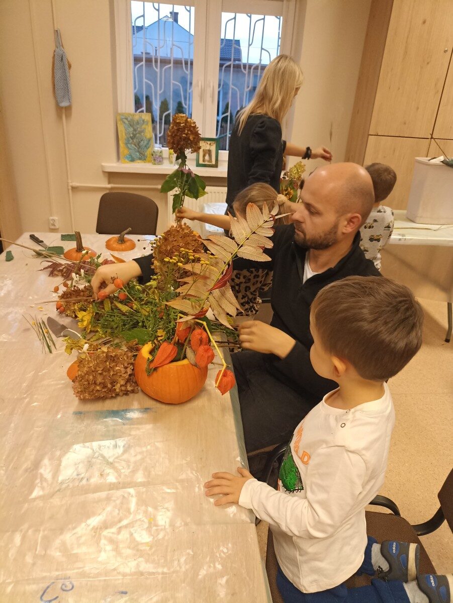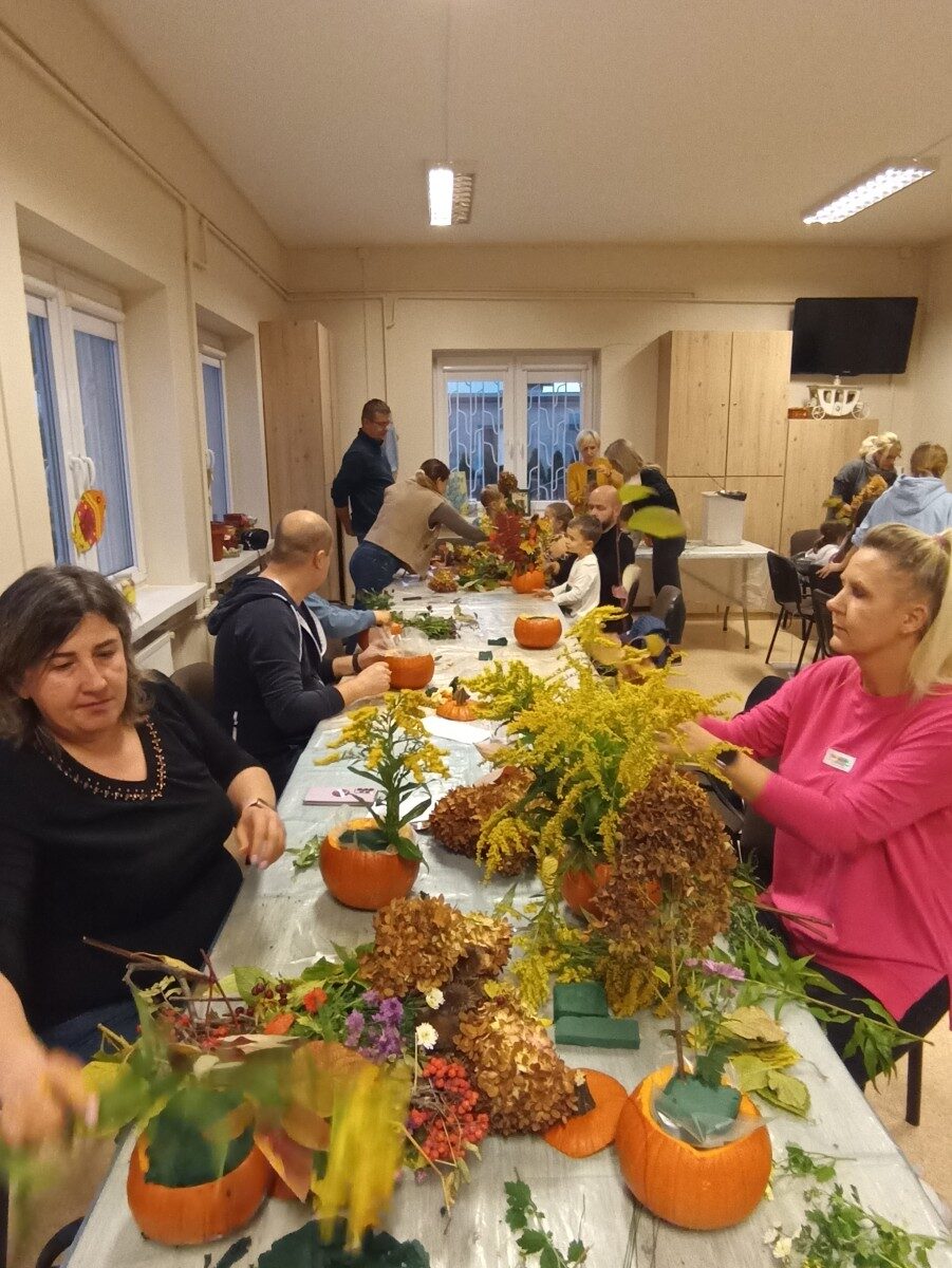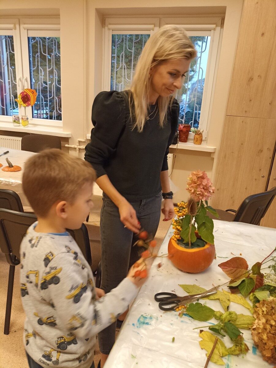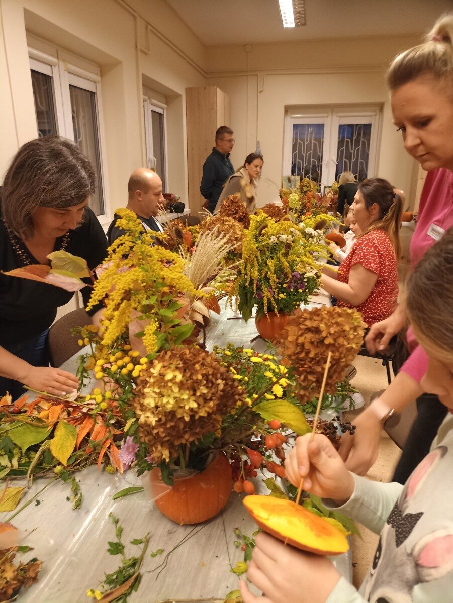 Dynia – królowa jesiennego stołu. Jesień piękna, kolorowa wprost zachwyca. Przecudne dekoracje na stół ” dyniowe wazony” wykonali uczestnicy niedzielnych warsztatów, pod czujnym okiem instruktor Katarzyny Cyniak- Górneckiej  w Filii Bronisze.