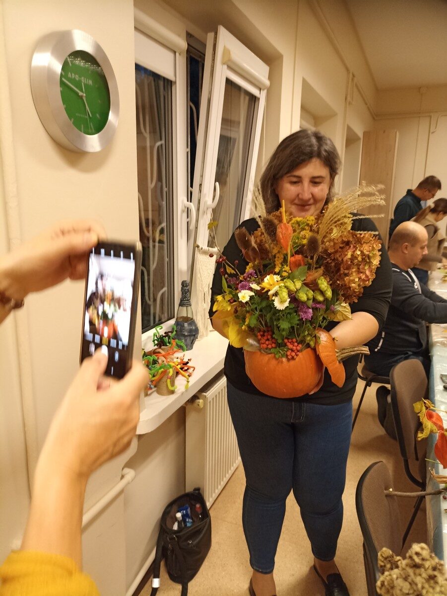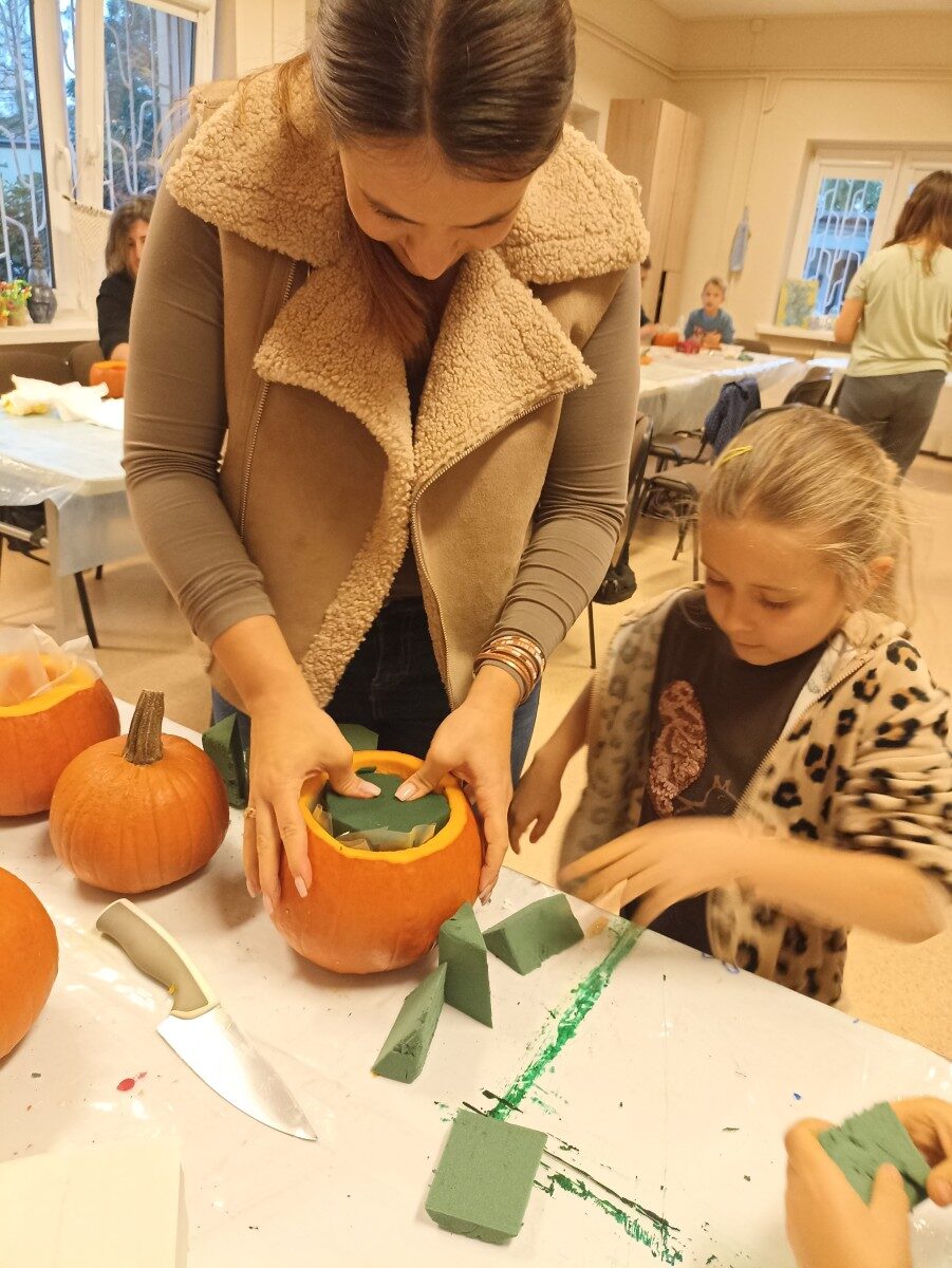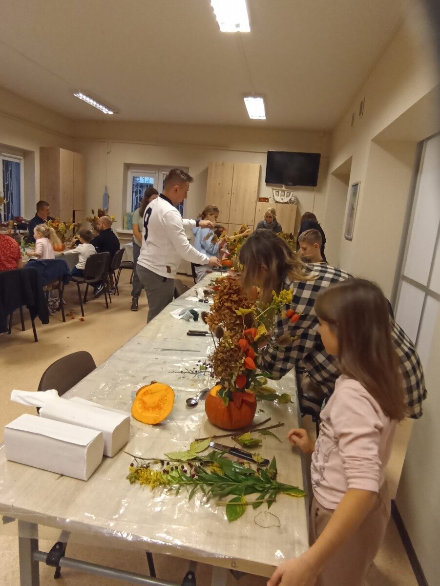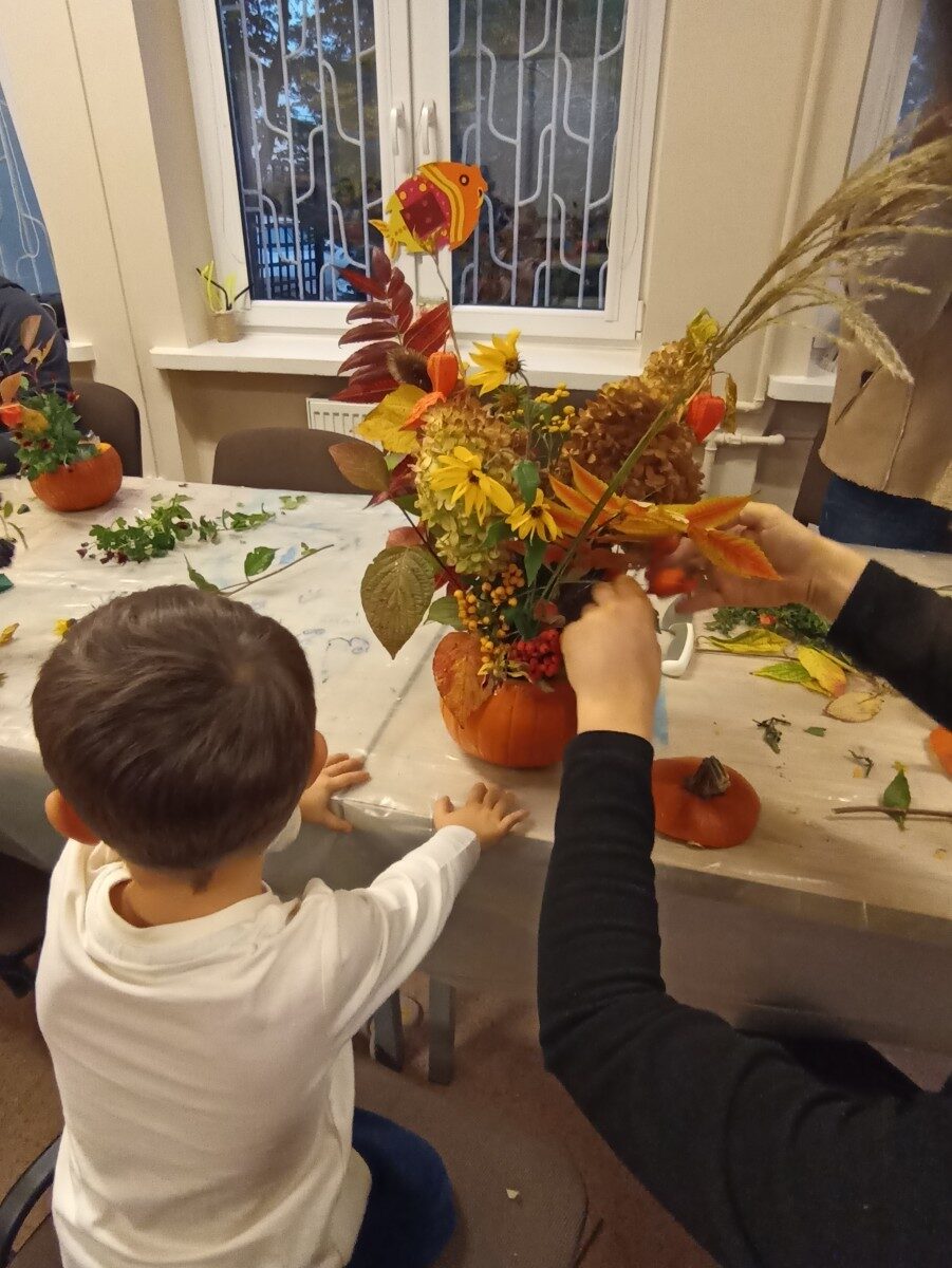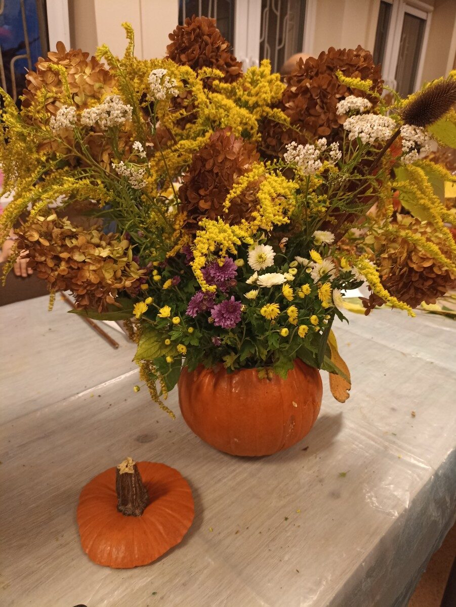 Dynia – królowa jesiennego stołu. Jesień piękna, kolorowa wprost zachwyca. Przecudne dekoracje na stół ” dyniowe wazony” wykonali uczestnicy niedzielnych warsztatów, pod czujnym okiem instruktor Katarzyny Cyniak- Górneckiej  w Filii Bronisze.