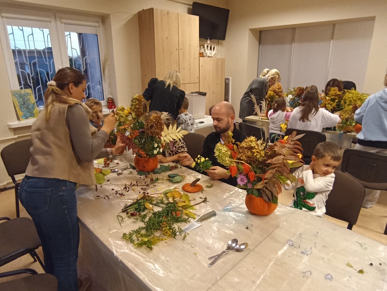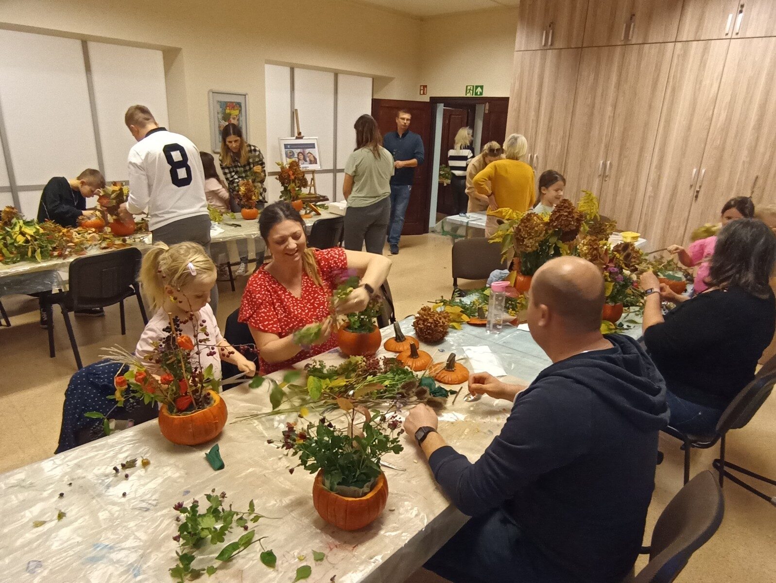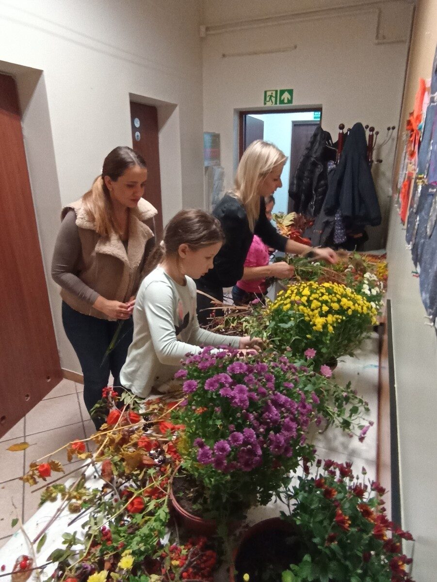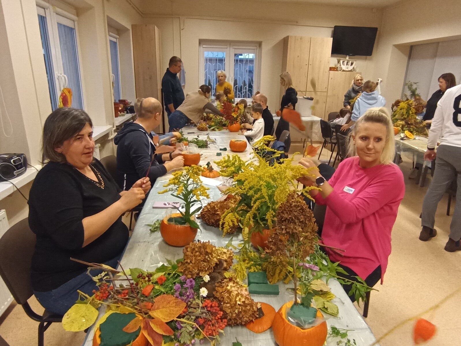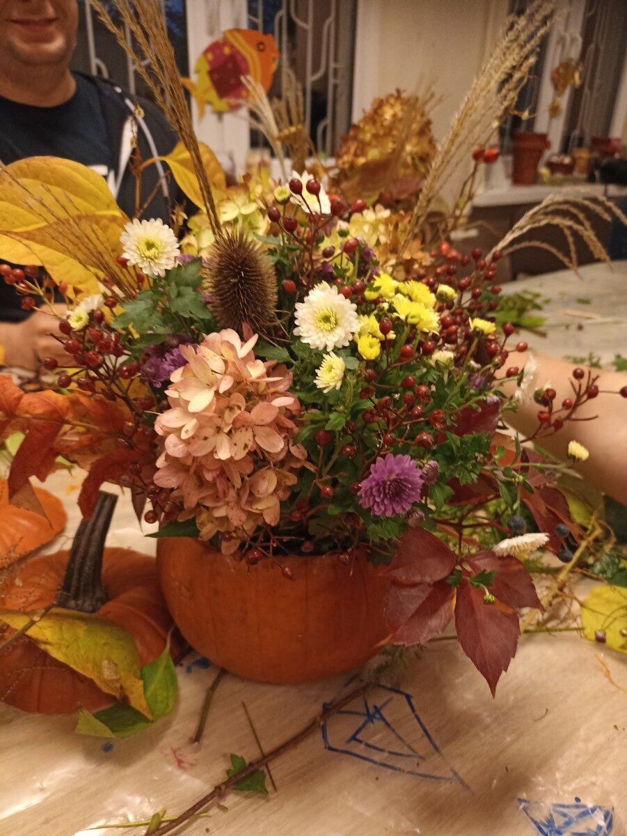 Dynia – królowa jesiennego stołu. Jesień piękna, kolorowa wprost zachwyca. Przecudne dekoracje na stół ” dyniowe wazony” wykonali uczestnicy niedzielnych warsztatów, pod czujnym okiem instruktor Katarzyny Cyniak- Górneckiej  w Filii Bronisze.
