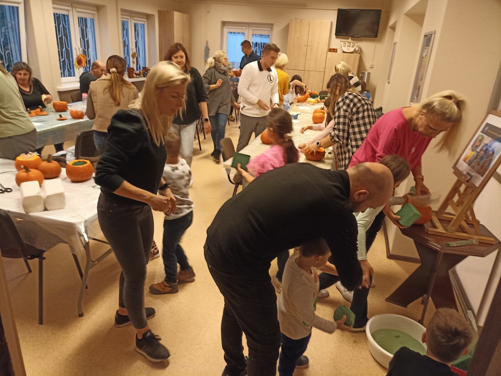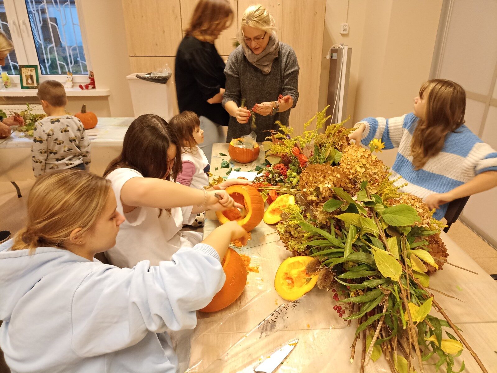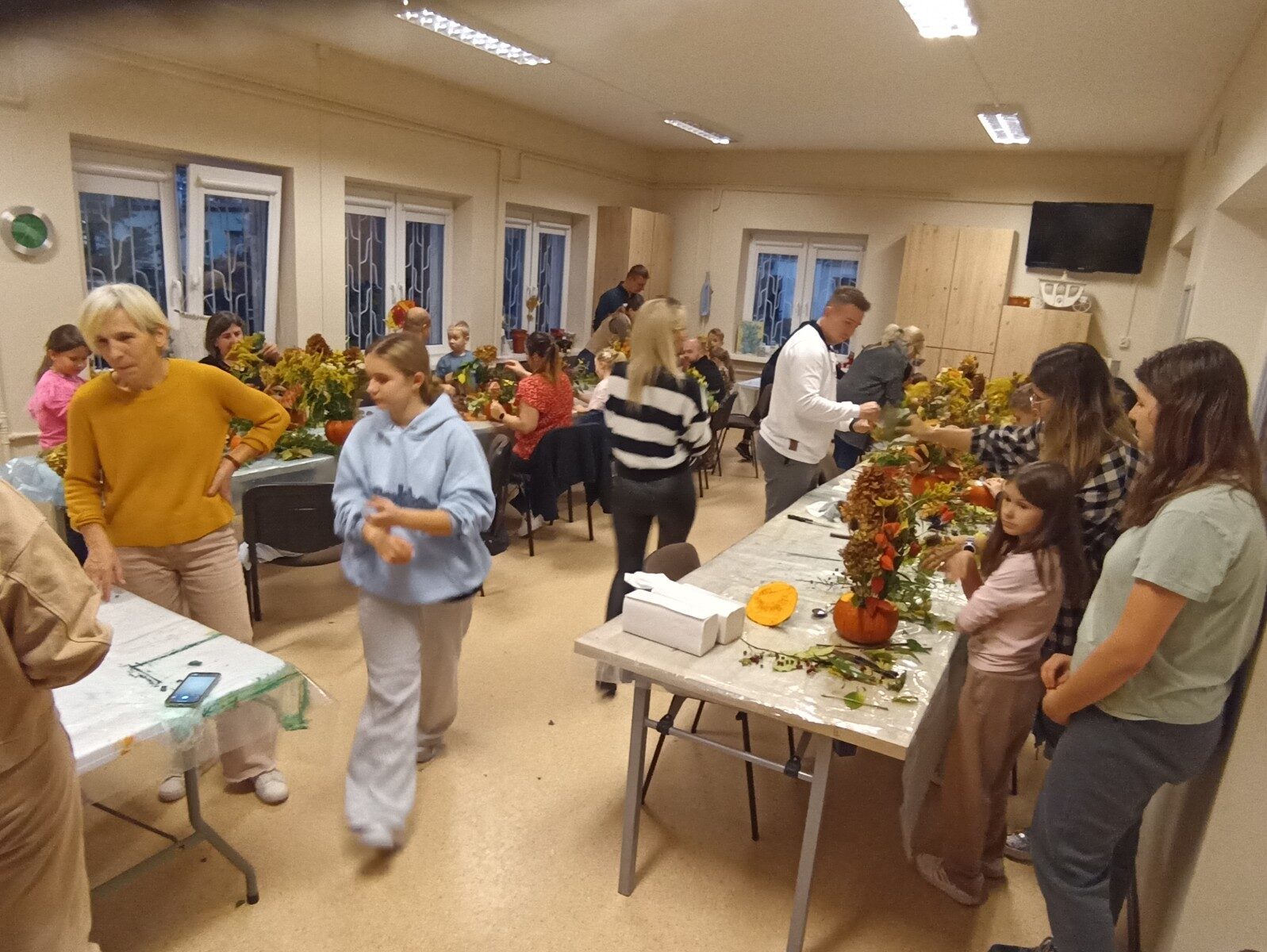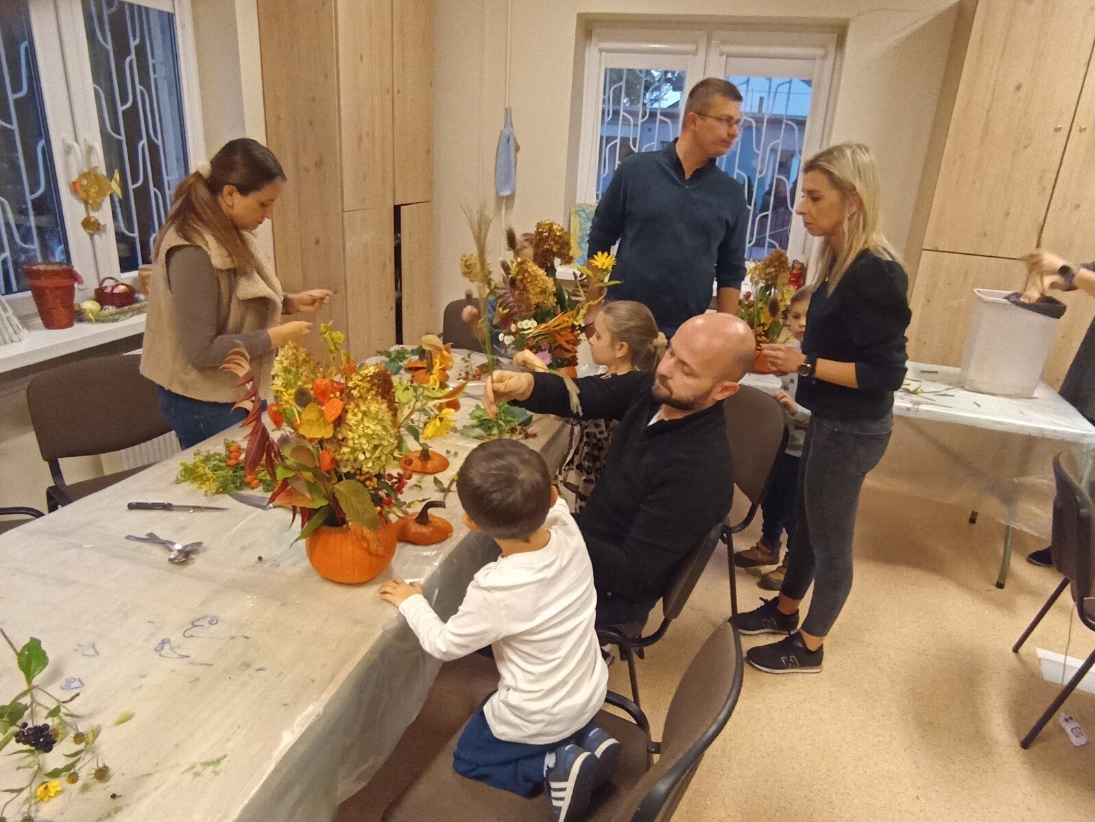 Dynia – królowa jesiennego stołu. Jesień piękna, kolorowa wprost zachwyca. Przecudne dekoracje na stół ” dyniowe wazony” wykonali uczestnicy niedzielnych warsztatów, pod czujnym okiem instruktor Katarzyny Cyniak- Górneckiej  w Filii Bronisze.