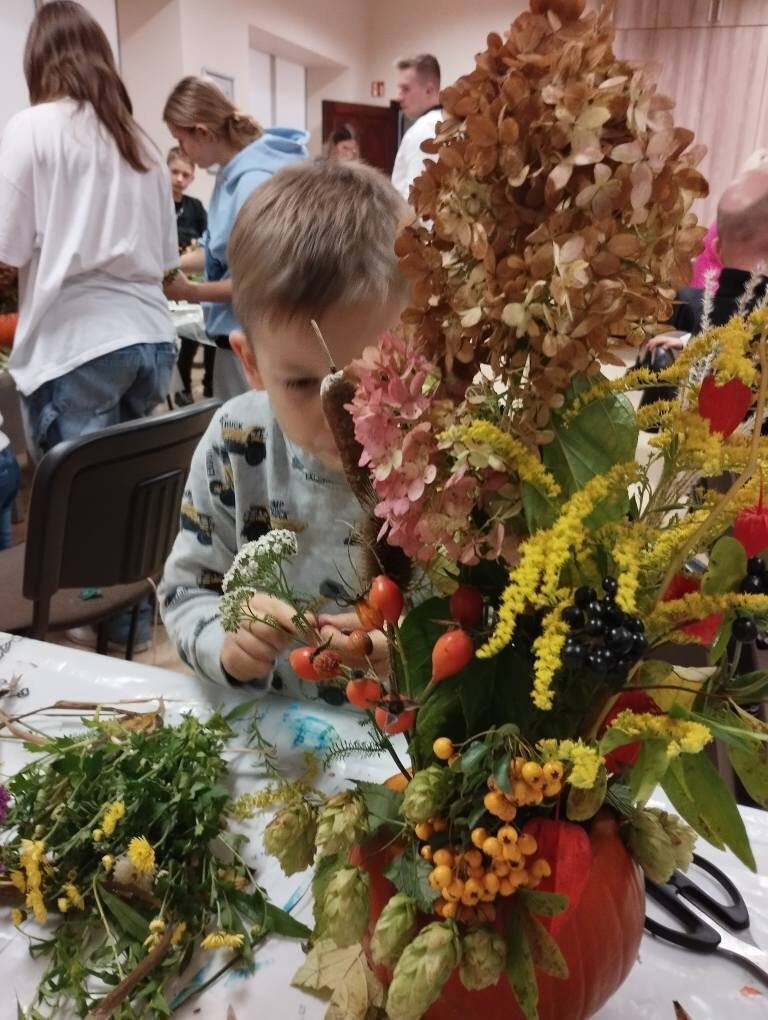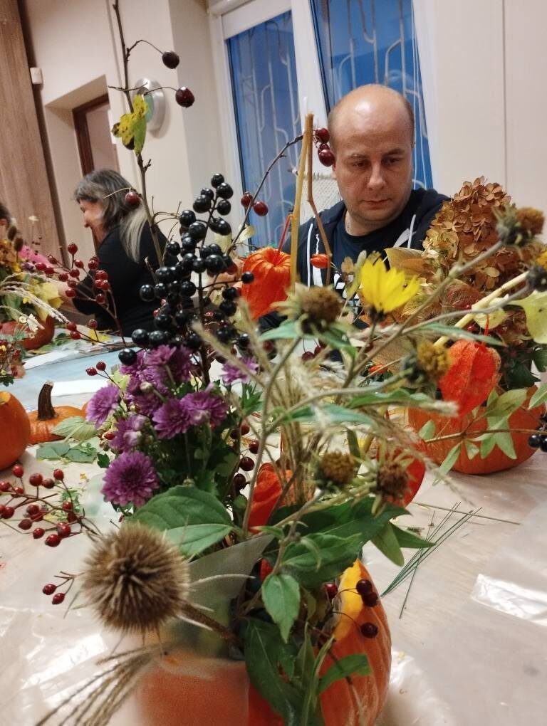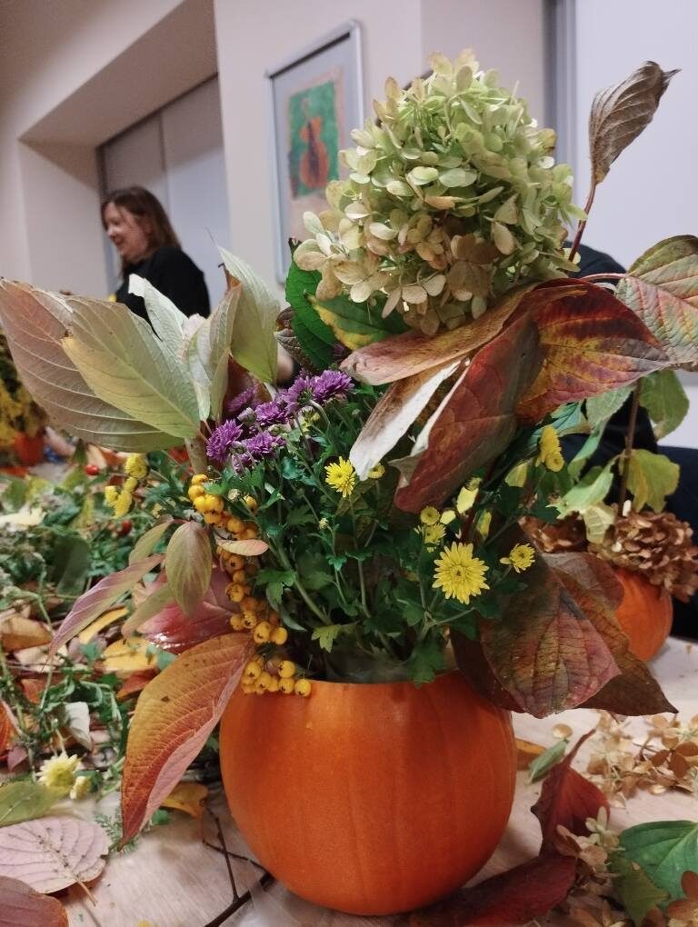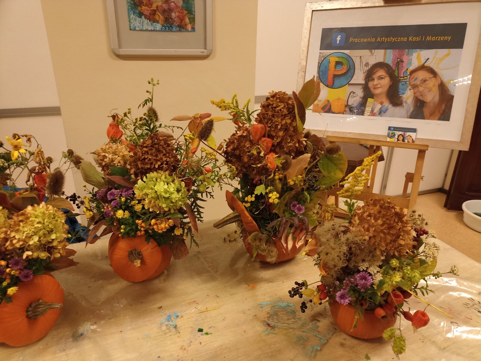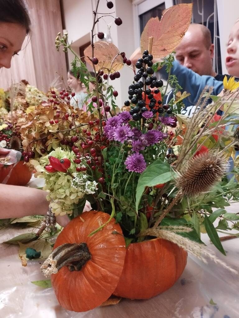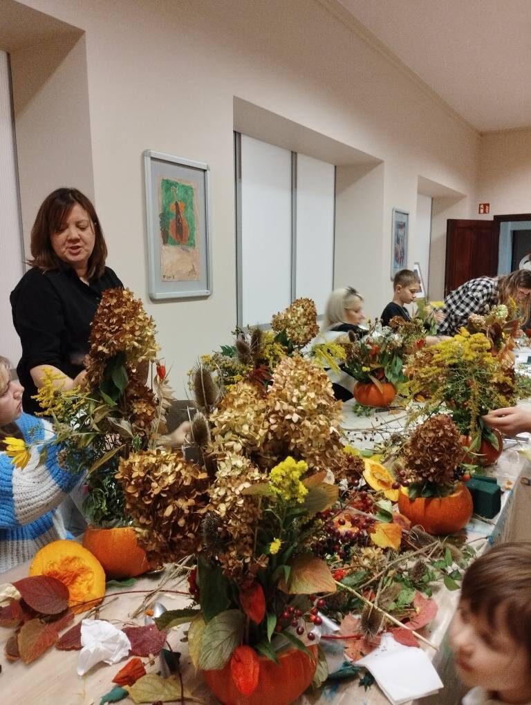Dynia – królowa jesiennego stołu. Jesień piękna, kolorowa wprost zachwyca. Przecudne dekoracje na stół ” dyniowe wazony” wykonali uczestnicy niedzielnych warsztatów, pod czujnym okiem instruktor Katarzyny Cyniak- Górneckiej  w Filii Bronisze.