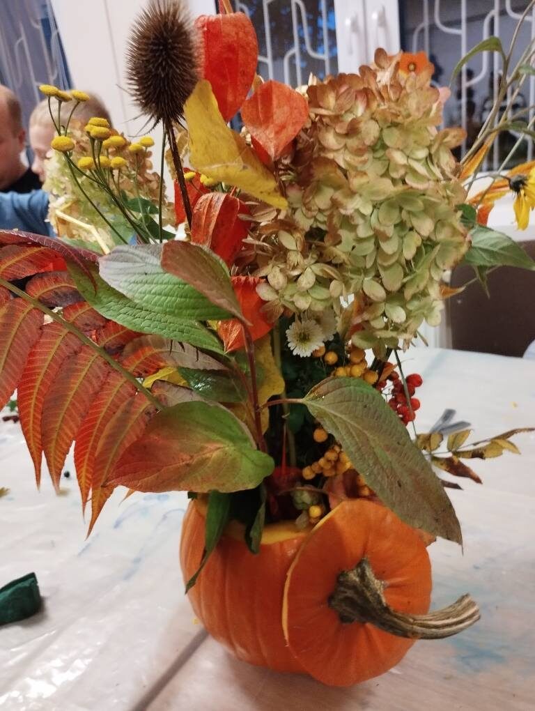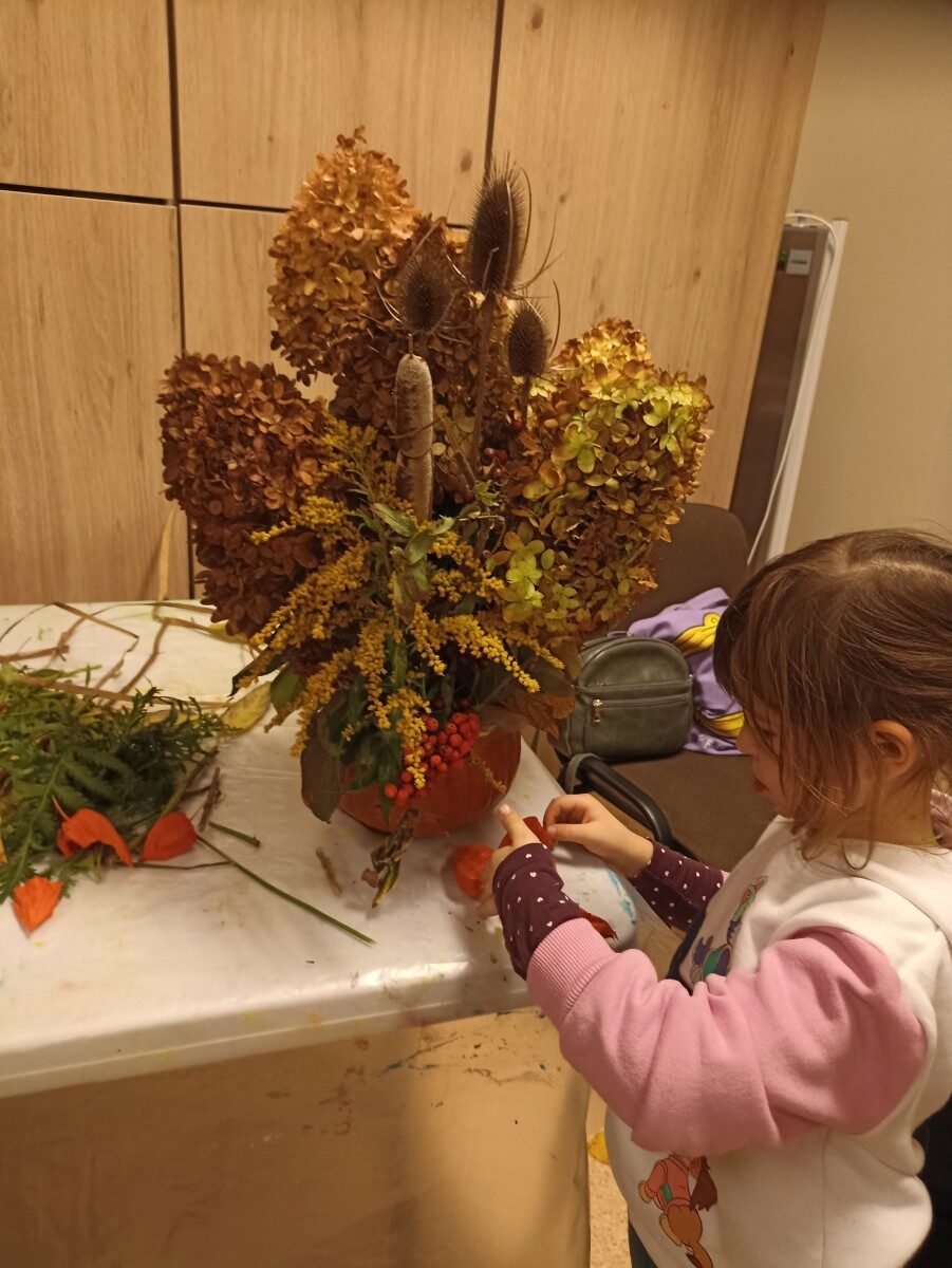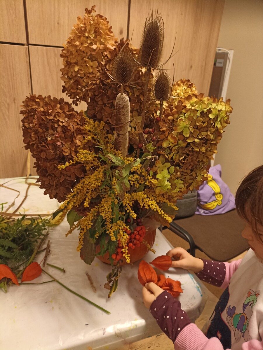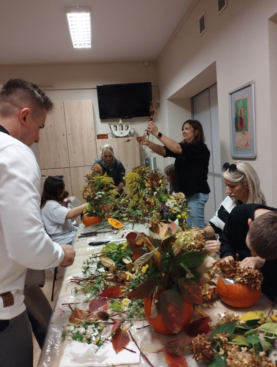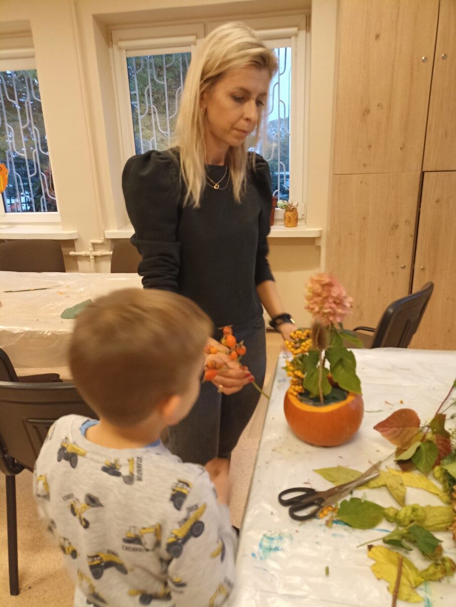 Dynia – królowa jesiennego stołu. Jesień piękna, kolorowa wprost zachwyca. Przecudne dekoracje na stół ” dyniowe wazony” wykonali uczestnicy niedzielnych warsztatów, pod czujnym okiem instruktor Katarzyny Cyniak- Górneckiej  w Filii Bronisze.