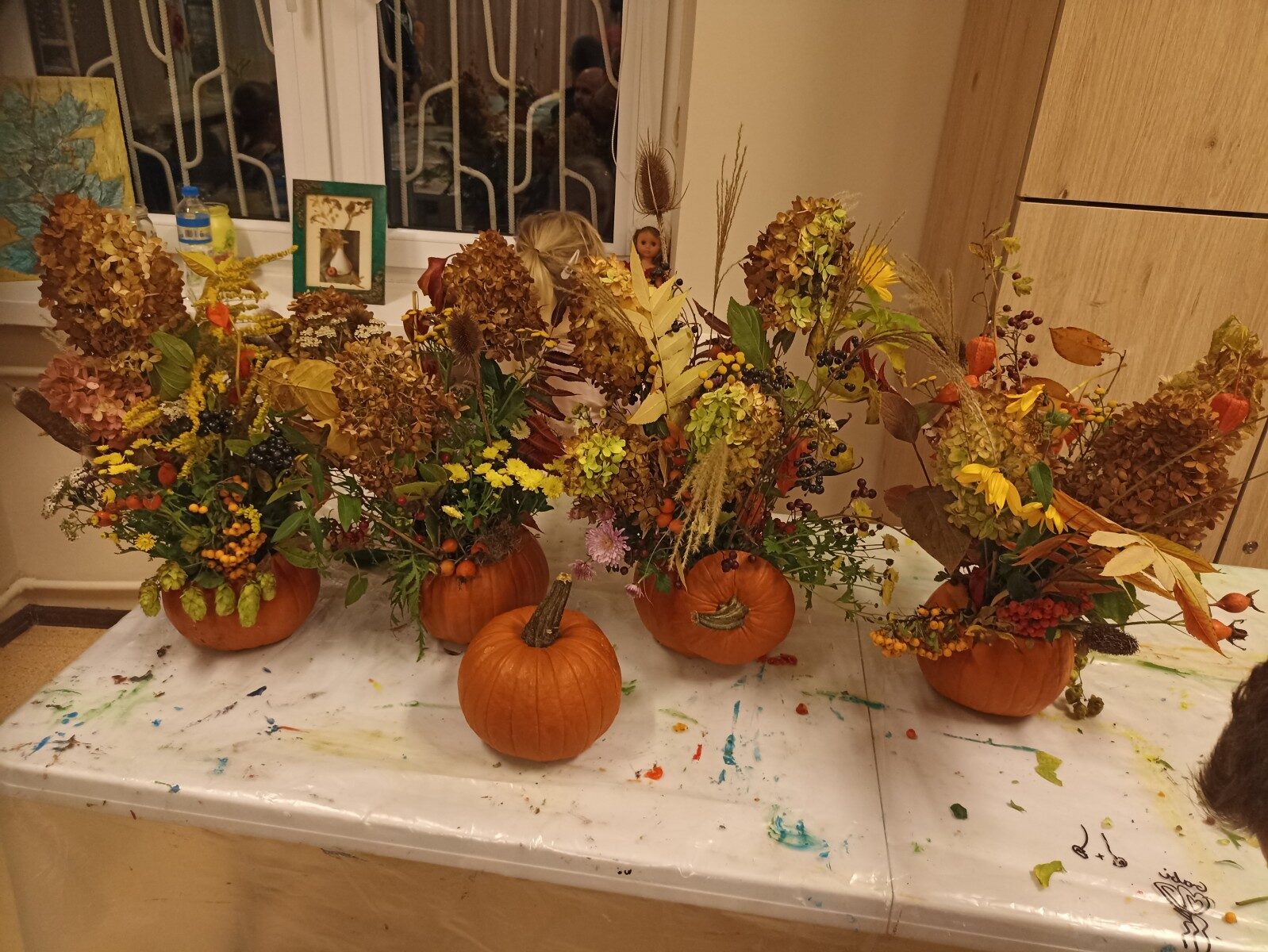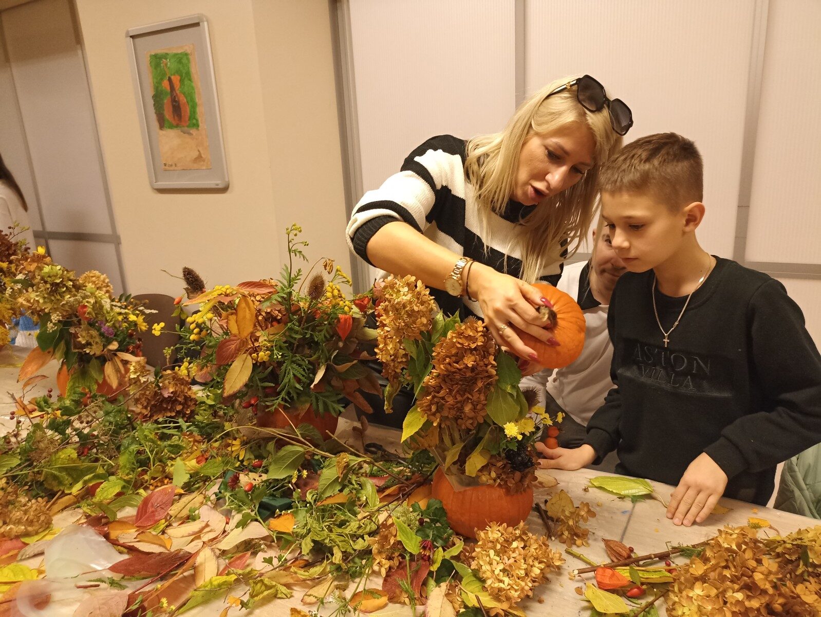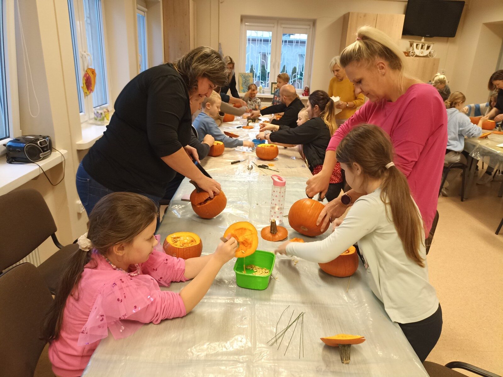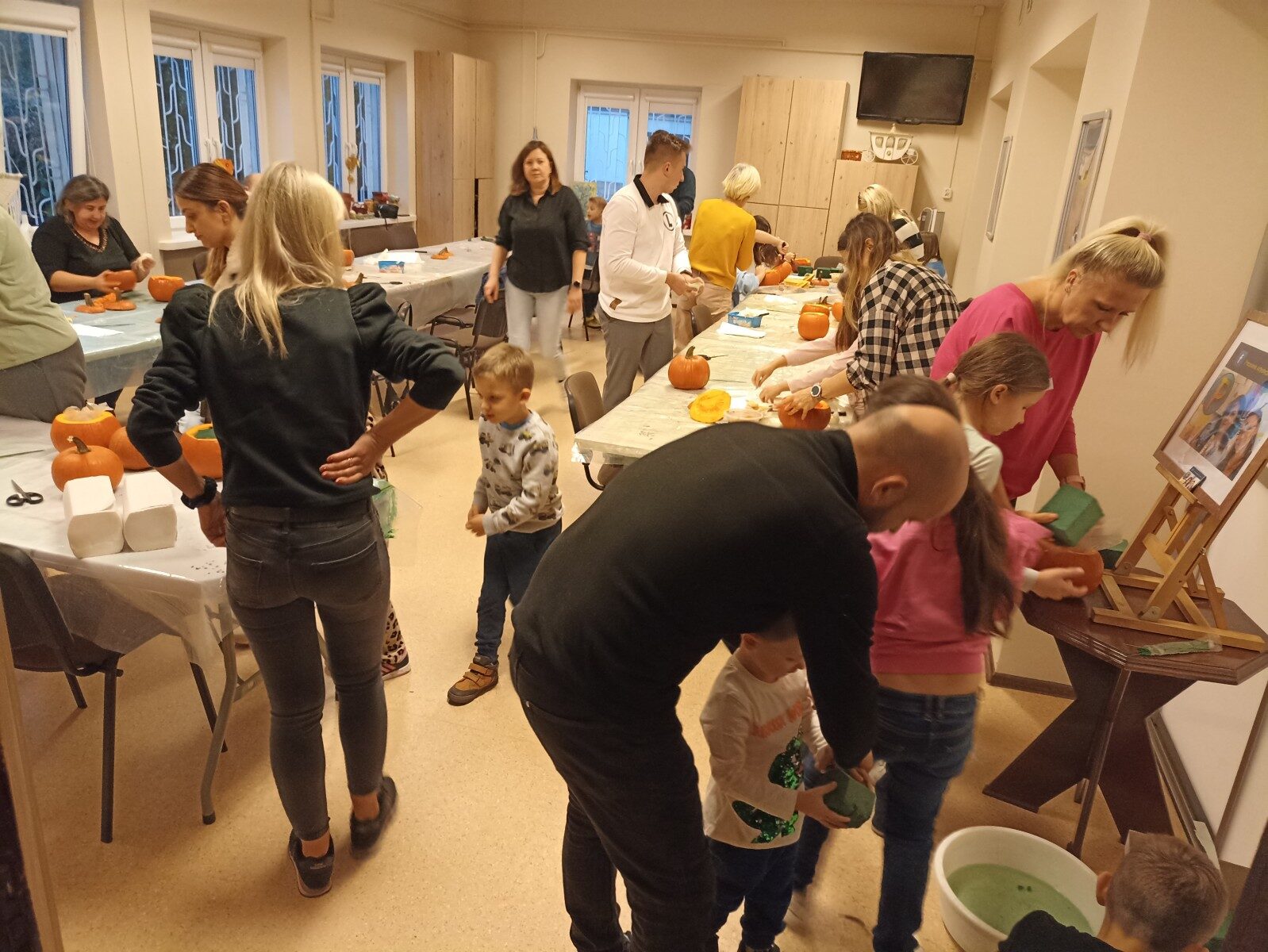 Dynia – królowa jesiennego stołu. Jesień piękna, kolorowa wprost zachwyca. Przecudne dekoracje na stół ” dyniowe wazony” wykonali uczestnicy niedzielnych warsztatów, pod czujnym okiem instruktor Katarzyny Cyniak- Górneckiej  w Filii Bronisze.