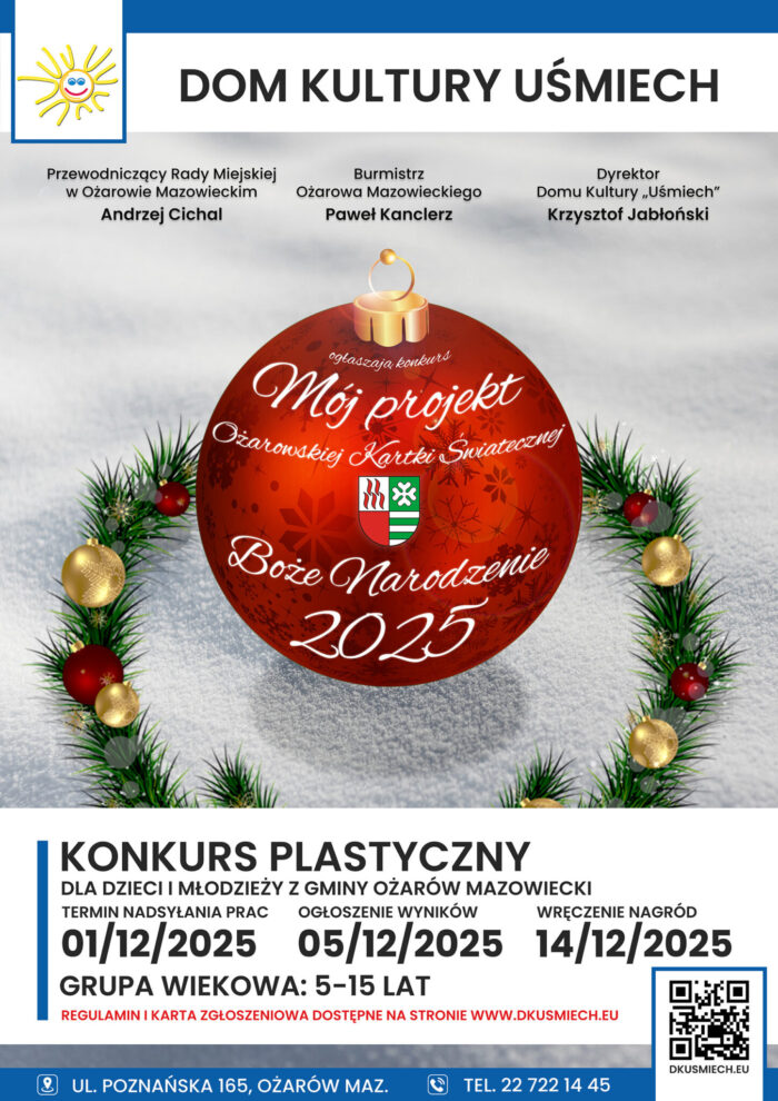 Burmistrz Ożarowa Mazowieckiego oraz Dyrektor Domu Kultury „Uśmiech” w Ożarowie Mazowieckim ogłasza konkurs plastyczny dla dzieci i młodzieży z Gminy Ożarów Mazowiecki „ MÓJ PROJEKT OŻAROWSKIEJ KARTKI ŚWIĄTECZNEJ” BOŻE NARODZENIE 2025