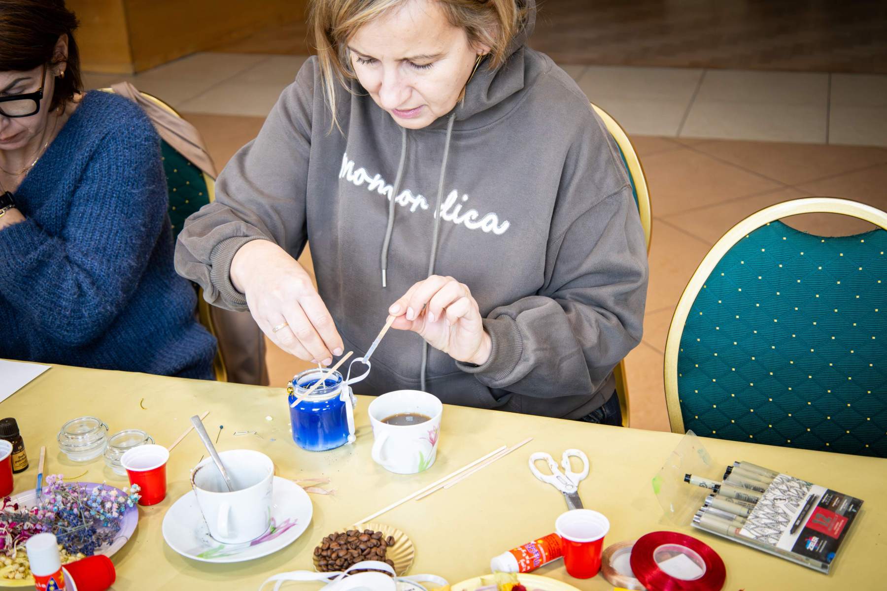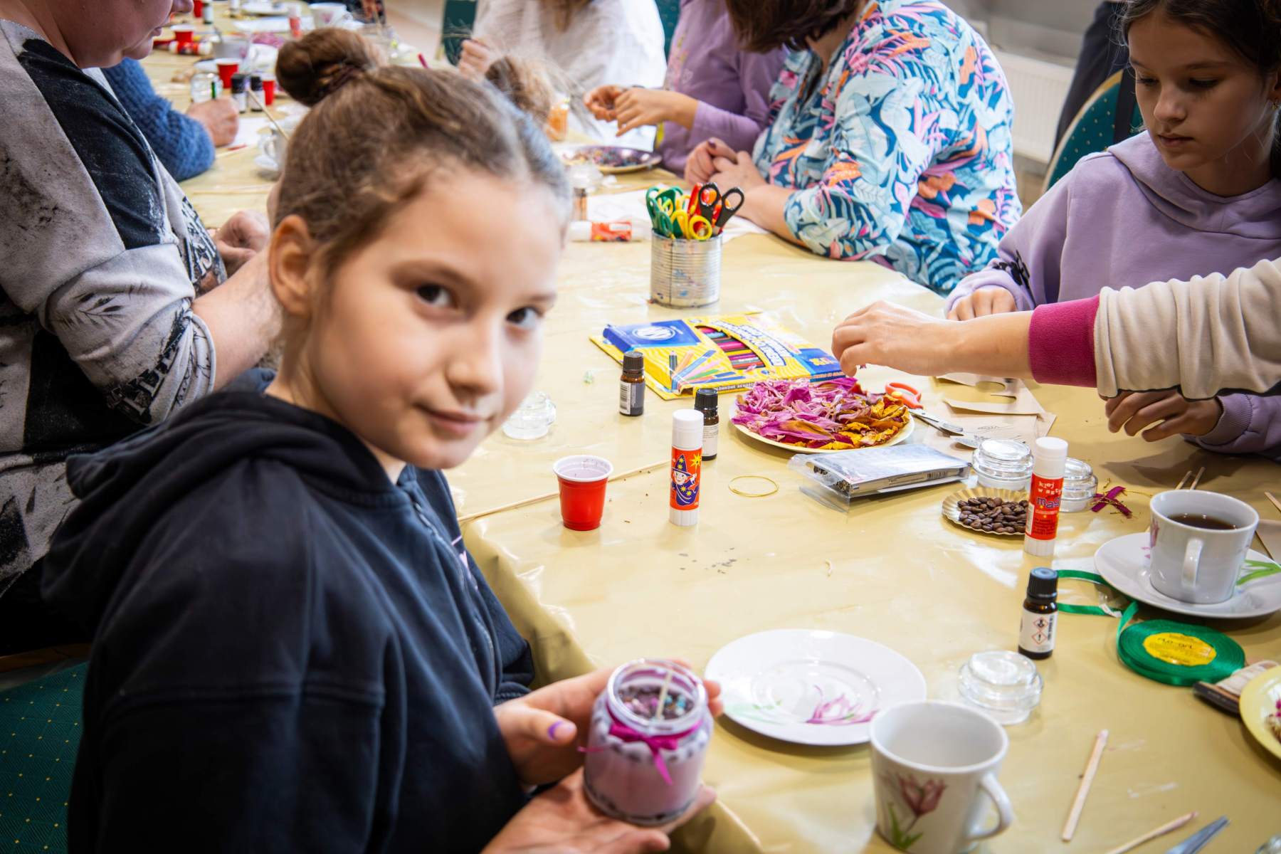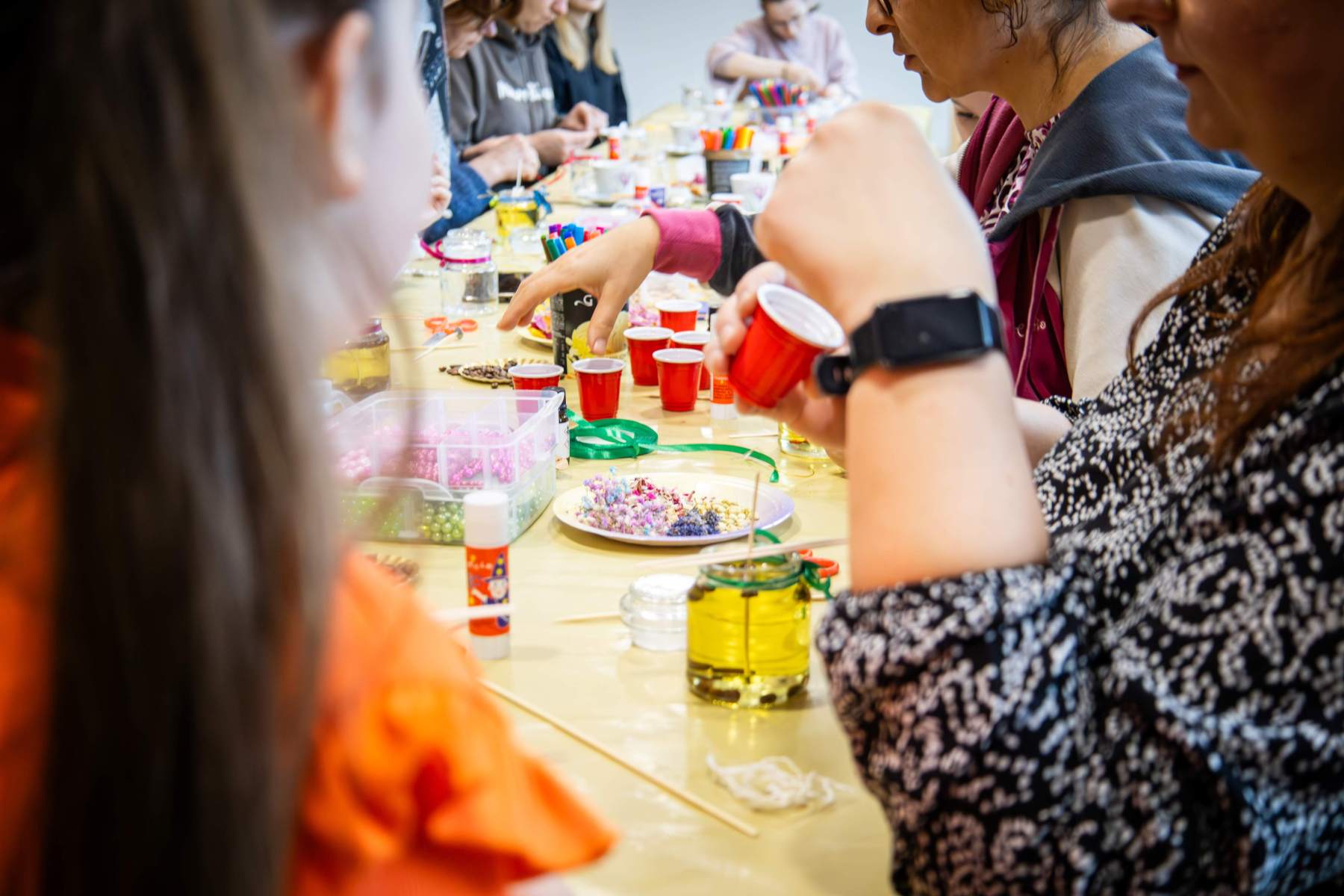 Punktualnie o 12:00 zebrani uczestnicy rozpoczęli pracę nad świecami sojowymi własnej produkcji. Do dyspozycji uczestników był szereg dodatków aromatycznych oraz wszystkie niezbędne składniki, a – przede wszystkim – nieprzerwane wspacie Marty i Sylwii, które prowadziły warsztaty. Etapów produkcyjnych było kilka, zajęcie było czasochłonne, a efekty – widoczne na zdjęciach – mówią same za siebie. Powstałe małe aromatyczne dzieła sztuki nasi uczestnicy zabrali ze sobą – mamy nadzieję, że zabiorą Was z powrotem do krainy “zapachu ukojenia”.