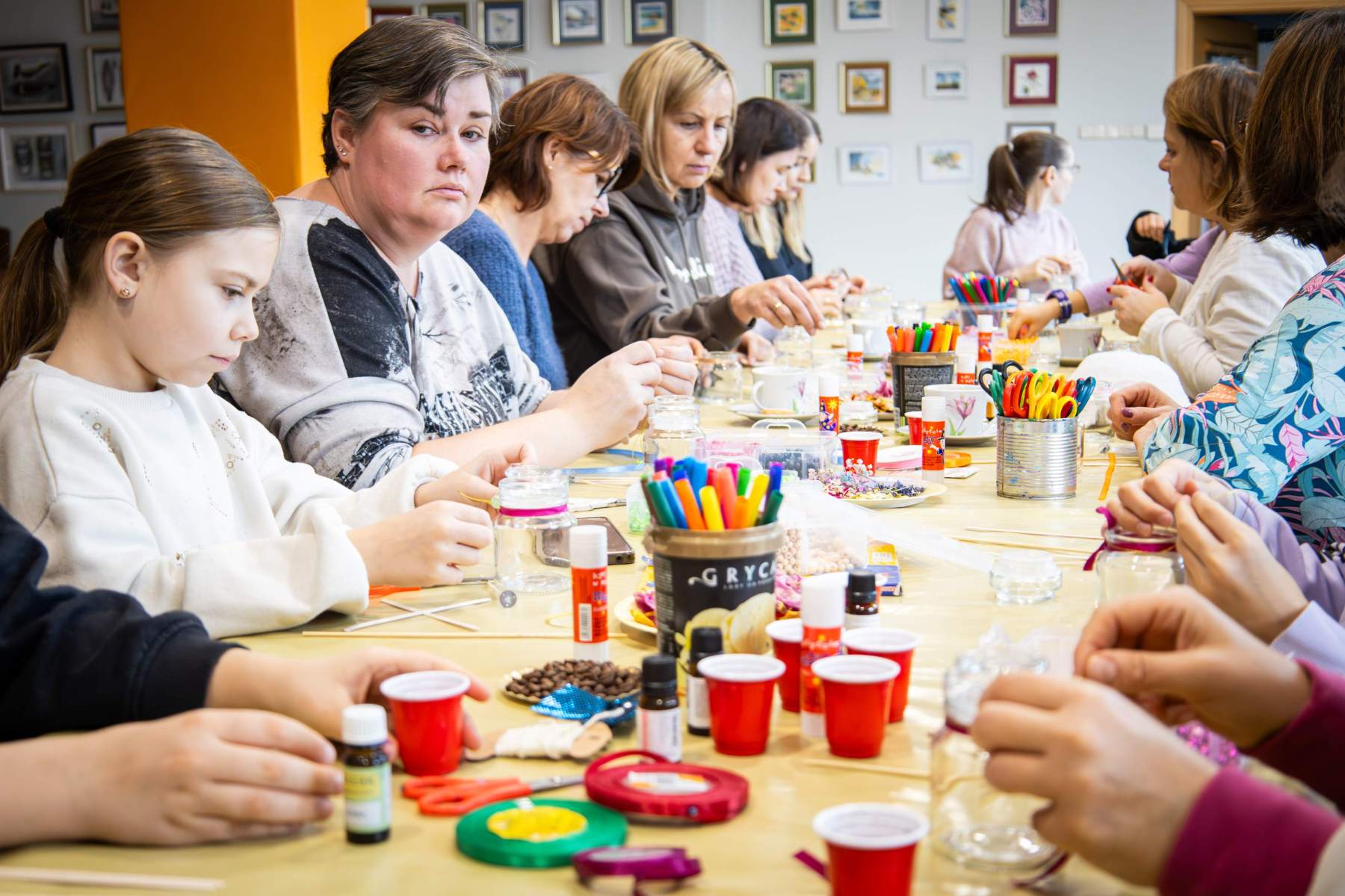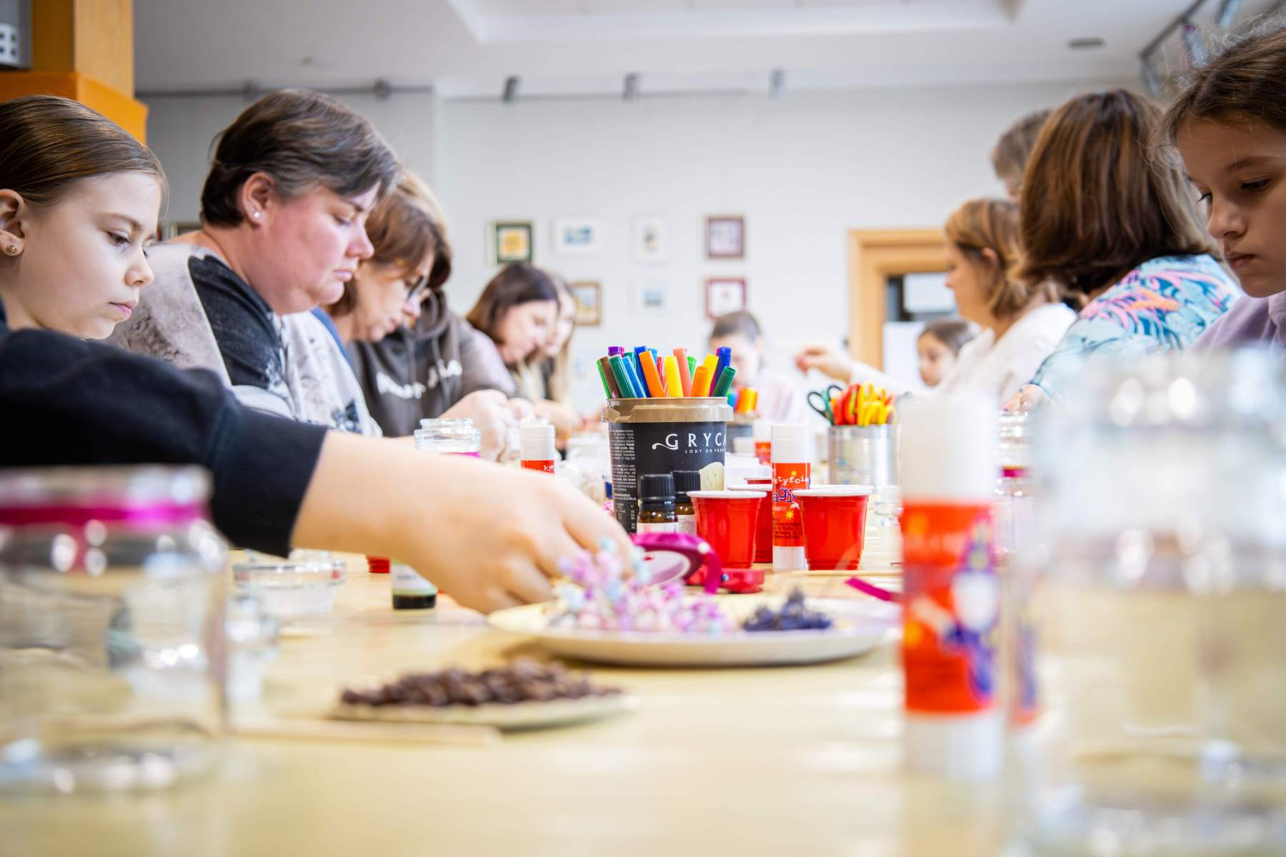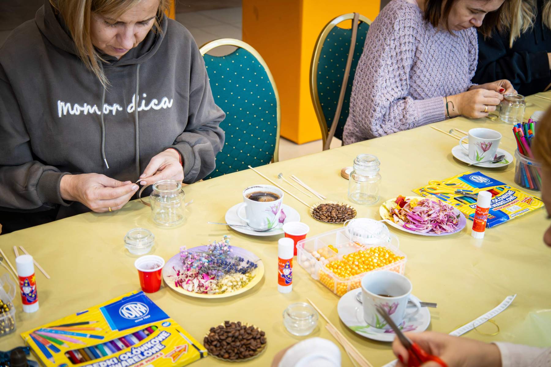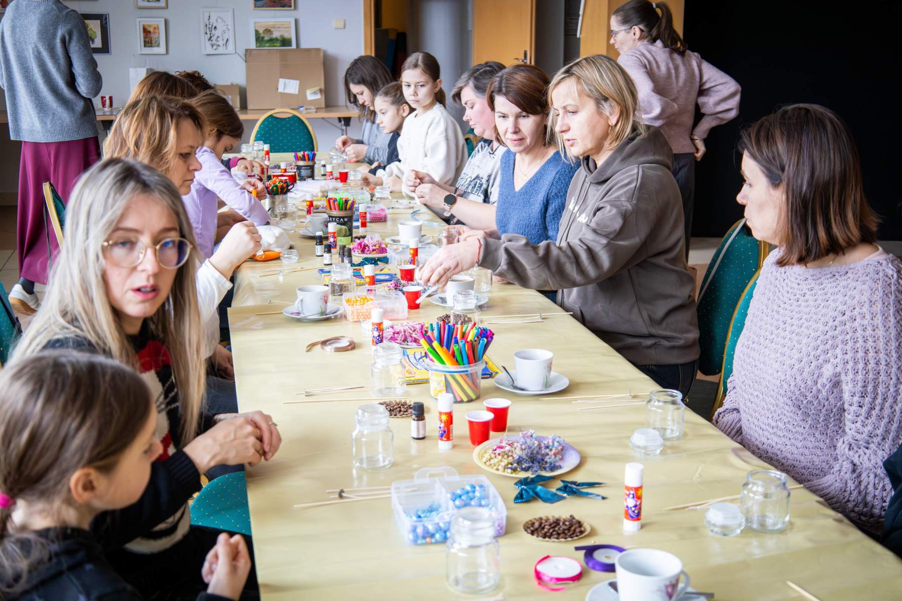Punktualnie o 12:00 zebrani uczestnicy rozpoczęli pracę nad świecami sojowymi własnej produkcji. Do dyspozycji uczestników był szereg dodatków aromatycznych oraz wszystkie niezbędne składniki, a – przede wszystkim – nieprzerwane wspacie Marty i Sylwii, które prowadziły warsztaty. Etapów produkcyjnych było kilka, zajęcie było czasochłonne, a efekty – widoczne na zdjęciach – mówią same za siebie. Powstałe małe aromatyczne dzieła sztuki nasi uczestnicy zabrali ze sobą – mamy nadzieję, że zabiorą Was z powrotem do krainy “zapachu ukojenia”.