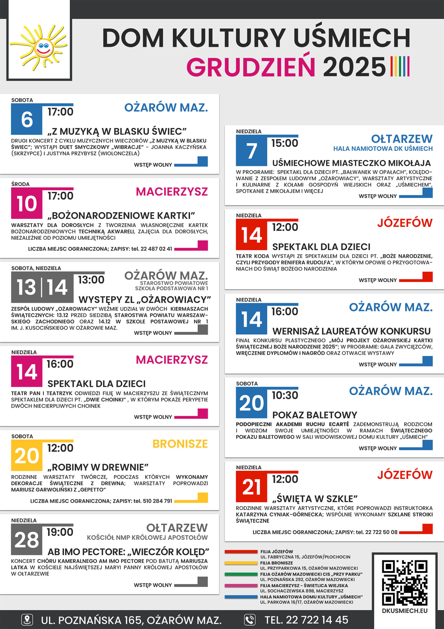 W związku ze zbliżającym się okresem świątecznym przypominamy o przerwie w prowadzeniu zajęć: od 22 grudnia 2025 r. do 6 stycznia 2026 r. zajęcia prowadzone w Domu Kultury Uśmiech oraz filiach są zawieszone.