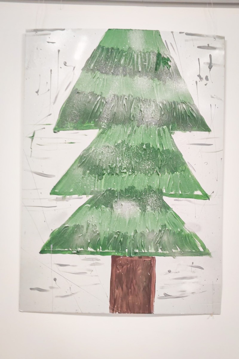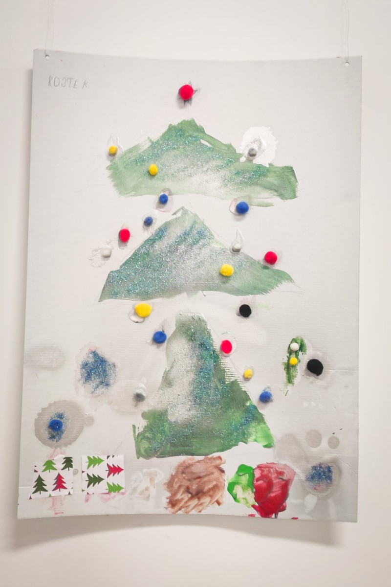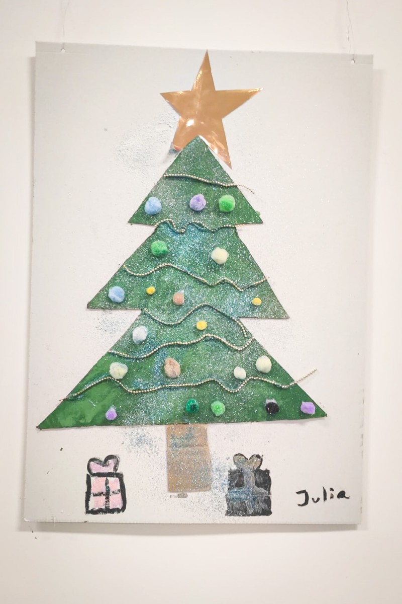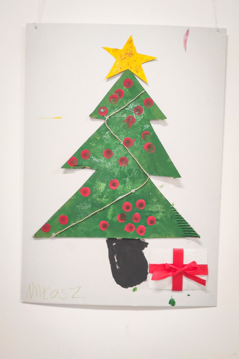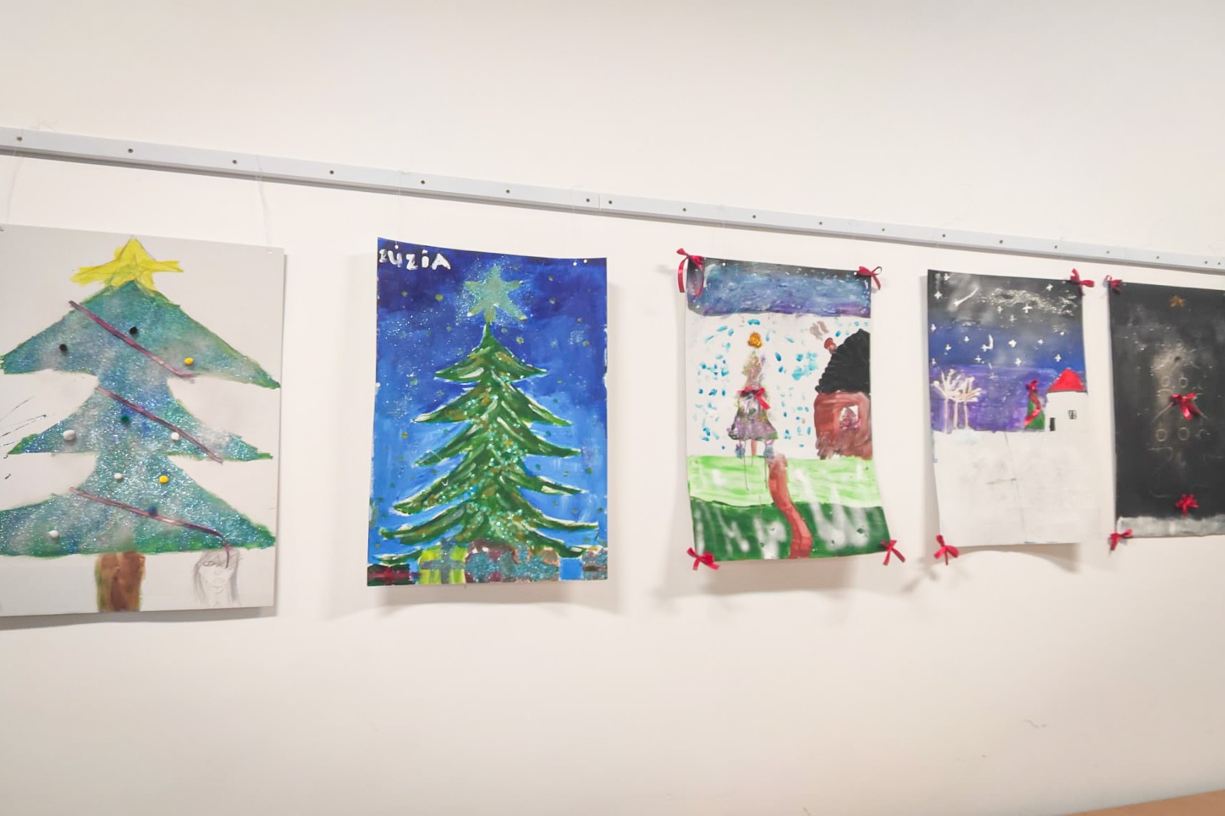 Na zakończenie warsztatów wszystkie prace zostały zaprezentowane na ścianach, tworząc kolorową, zimowo-świąteczną galerię.