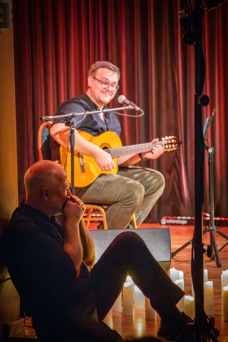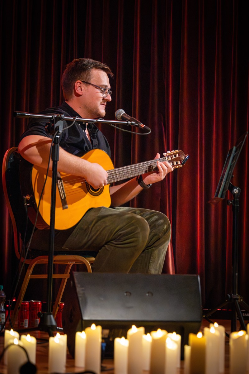 Artysta zabrał nas w melancholijną, jesienną podróż „Z muzyką w blasku świec”. Pełna sala gości przez ponad 2 godziny z zapartym tchem podziwiała talenty wokalno-gitarowe Macieja Ostrowskiego.