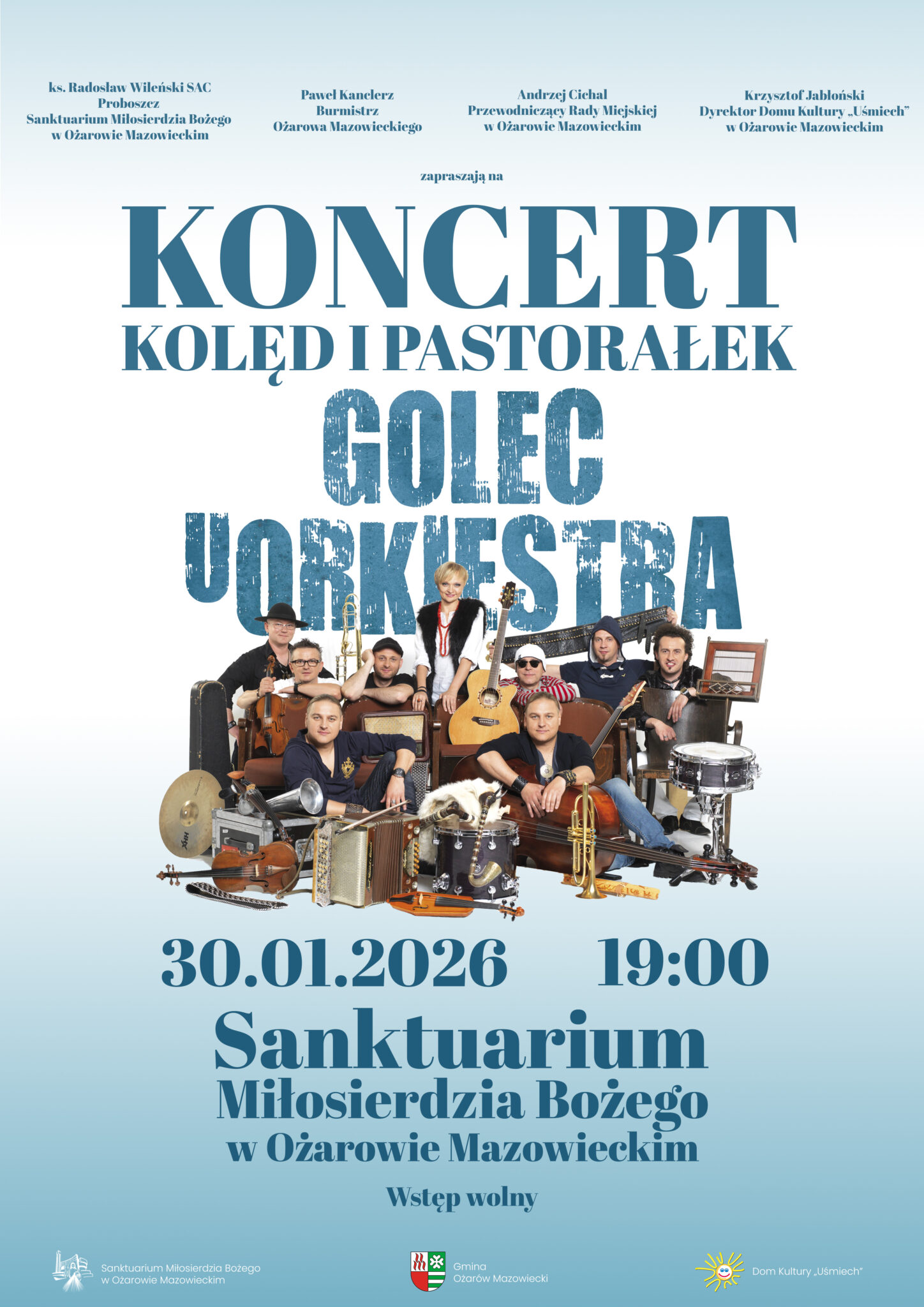 Na koncert Golec uOrkiestra w Sanktuarium Miłosierdzia Bożego w Ożarowie Mazowieckim zapraszają ks. Radosław Wileński SAC – Proboszcz Sanktuarium, Paweł Kanclerz – Burmistrz Ożarowa Mazowieckiego, Andrzej Cichal – Przewodniczący Rady Miejskiej w Ożarowie Maz. oraz Krzysztof Jabłoński – Dyrektor Domu Kultury “Uśmiech”.