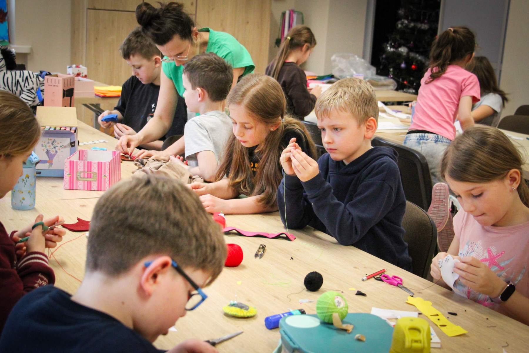 Na dzieci czekały zajęcia zarówno w sali warsztatowej, jak i w pobliskim parku. Wspólnie podjęliśmy się nauki szycia czy rysunku. Owocem dziecięcej inwencji był także śnieżny bałwan przed budynkiem filii, który stanął na straży dobrej atmosfery i zabawy.