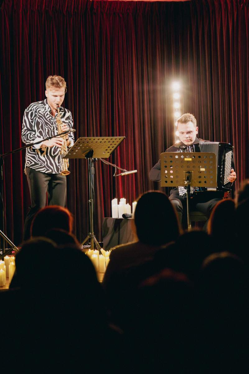 Muzyczna przygoda, w którą artyści zabrali ze sobą widownię jest jednym z tych zjawisk, gdy magia, kunszt i natchnienie zdaje się prowadzić muzyków poza granicę horyzontu wyobraźni. Za sprawą niezwykłe bogatego w harmonie połączenia barw saksofonu sopranowego oraz akordeonu znaleźliśmy się w miejscu, gdzie czas i przestrzeń zdawały się zanikać, a cała uwaga koncentrowała się wyłącznie na kolejnych taktach – niezwykle subtelnych, ale jakże czytelnych krokach tej artystycznej podróży.