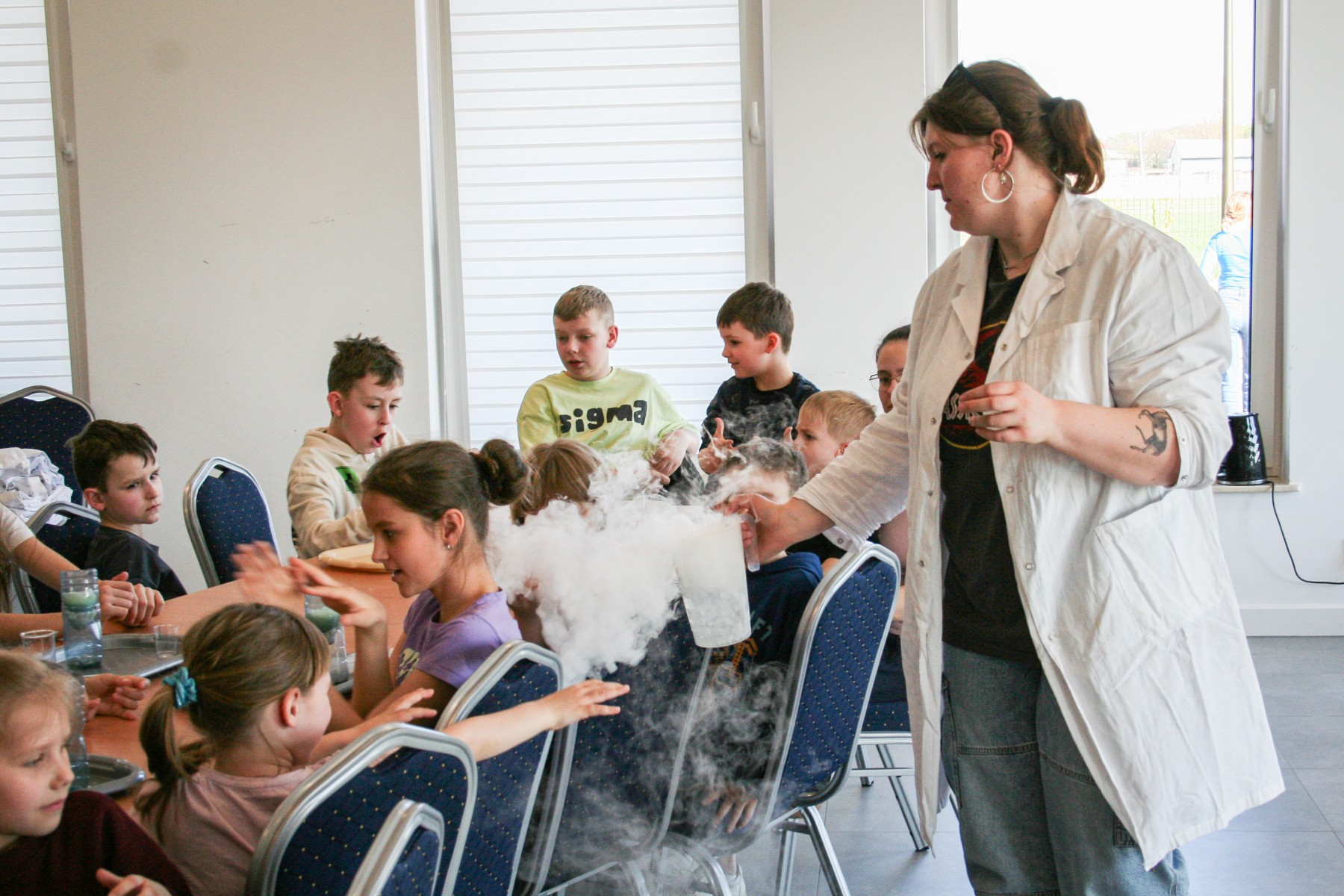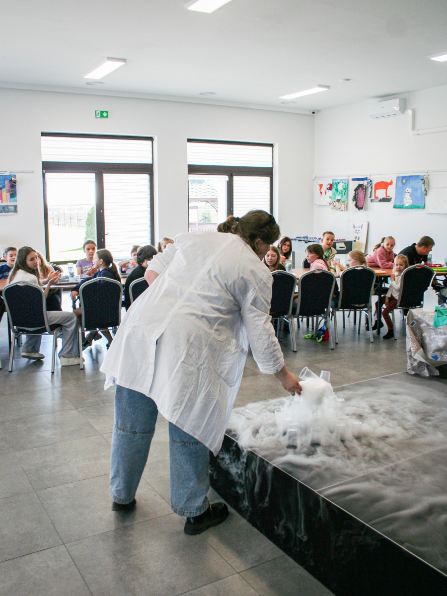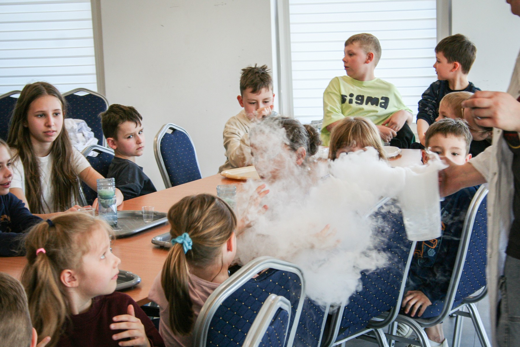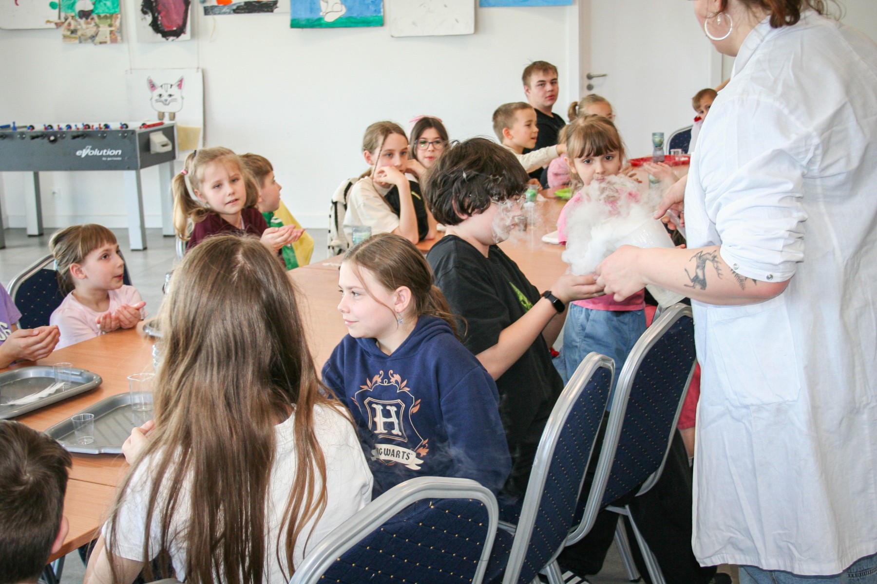 Na zakończenie czekała na wszystkich wyjątkowa atrakcja – „sesja zdjęciowa małego chemika”, podczas której dzieci mogły pozować w efektownej scenerii z suchym lodem.