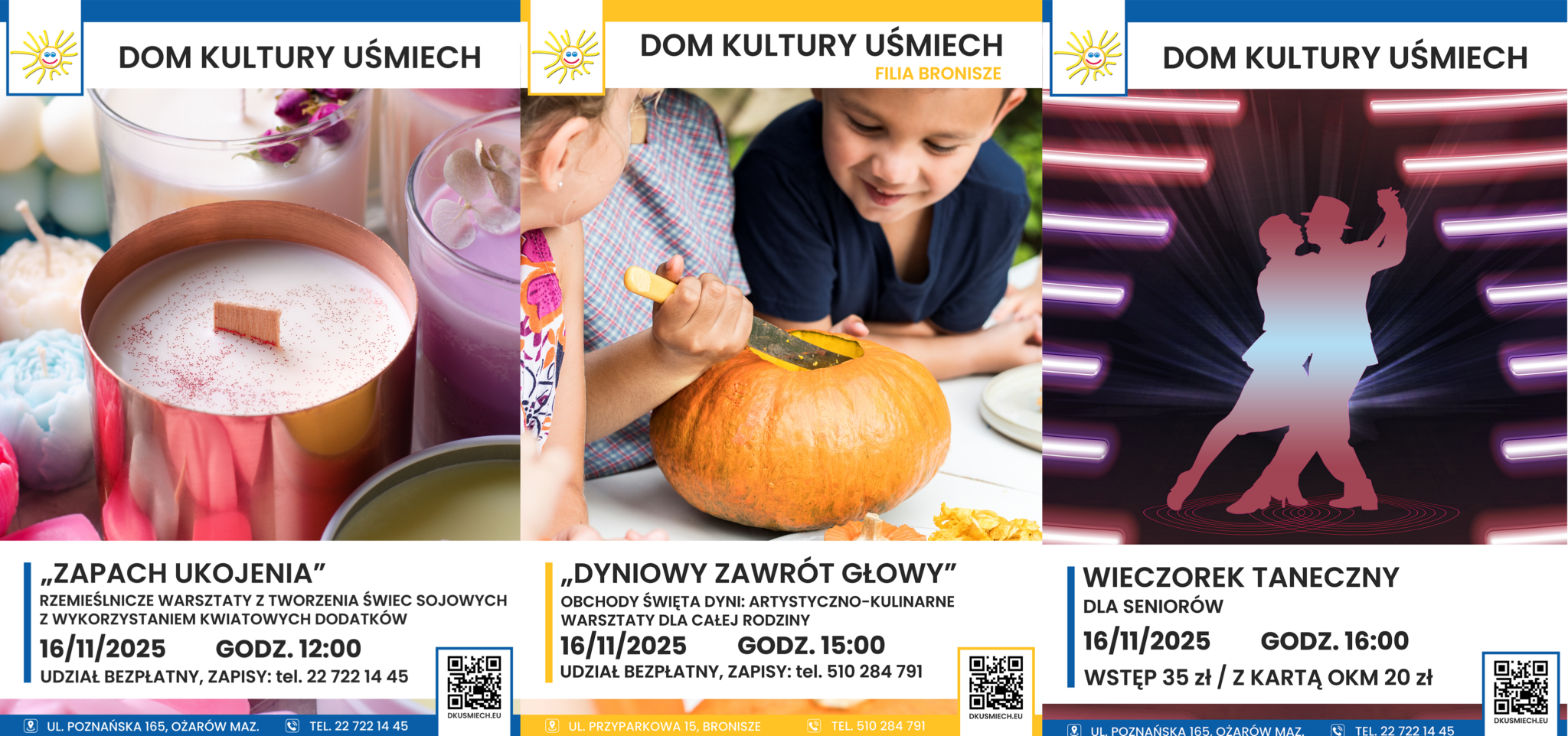 Wydarzenia w Domu Kultury „Uśmiech” – 16 listopada 2025 🕯️ „Zapach ukojenia” – warsztaty tworzenia świec sojowych Stwórz własną pachnącą świecę i poznaj tajniki dekorowania z pomocą instruktorów.📍 Gdzie: Dom Kultury