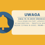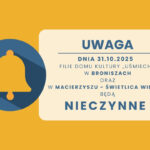 Informujemy, że w piątek, 31 października, filie Domu Kultury Uśmiech w Broniszach (ul. Przyparkowa 15 w Broniszach) Macierzysz – Świetlica Wiejska (ul. Sochaczewska 89B, Macierzysz) będą nieczynne.