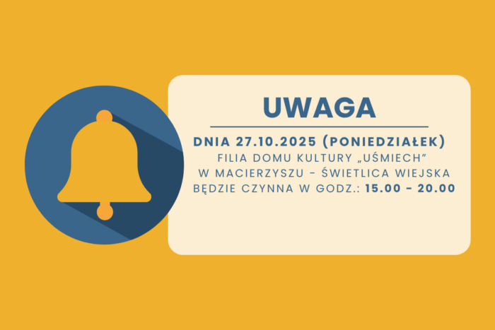 Informujemy, że w poniedziałek 27 października Filia Domu Kultury „Uśmiech” w Macierzyszu – Świetlica Wiejska będzie czynna w godzinach 15.00 – 20.00.