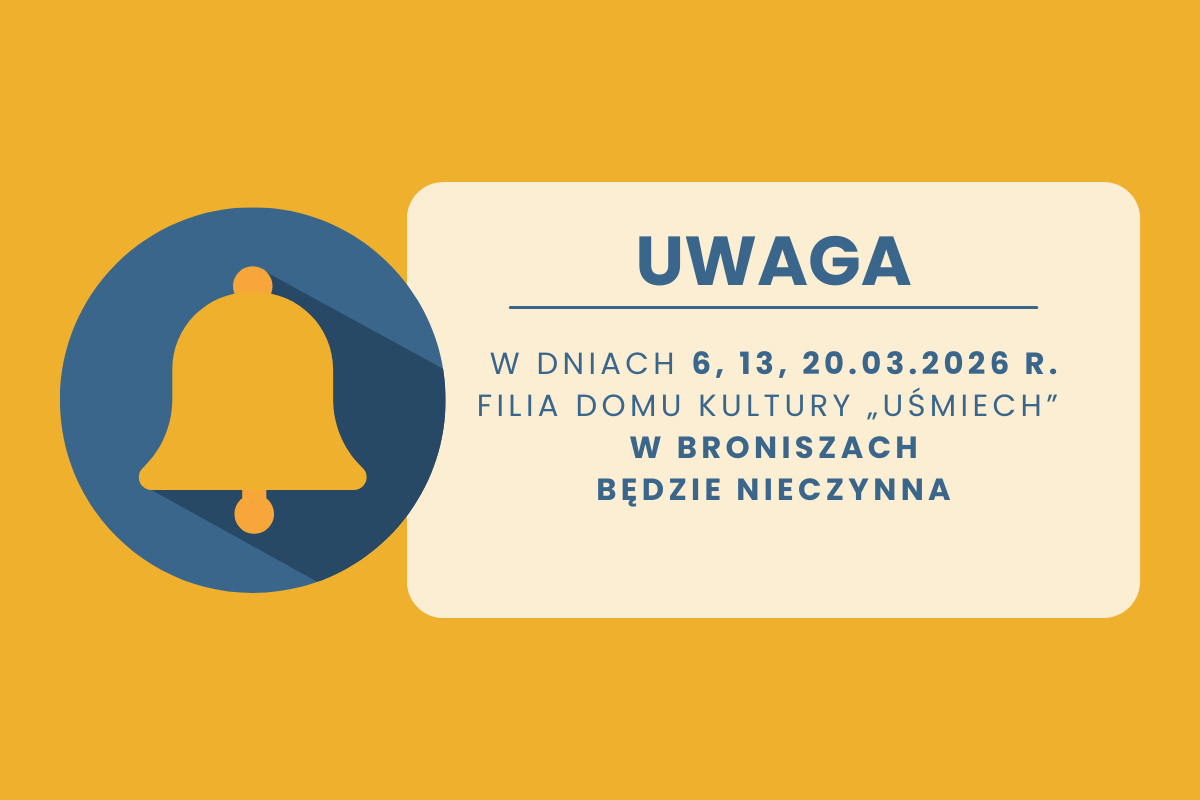 Informujemy, iż w dniach 6, 13, 20.03.2026 r. Filia Domu Kultury „Uśmiech” w Broniszach będzie nieczynna.