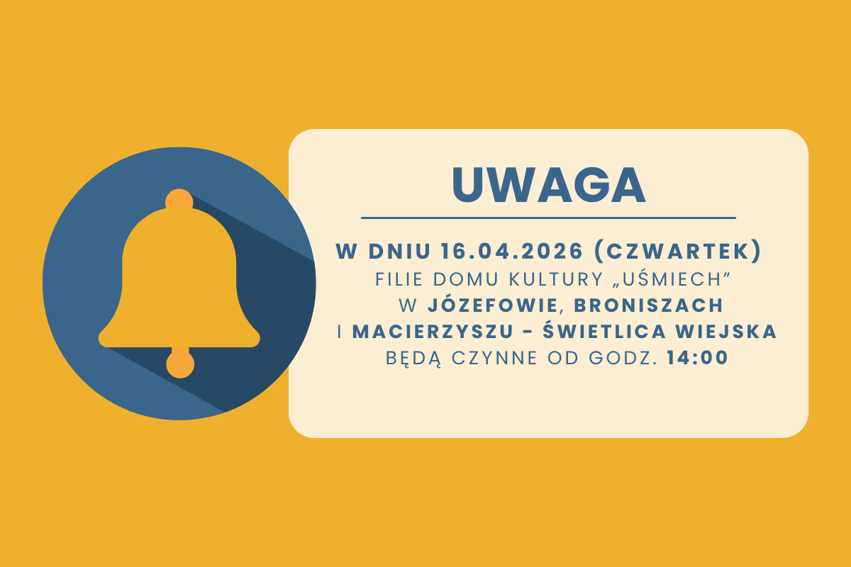 W dniu 16 kwietnia (czwartek) Filie Domu Kultury „Uśmiech” w: Józefowie, Broniszach i Macierzyszu – Świetlica Wiejska będą czynne od godziny 14:00