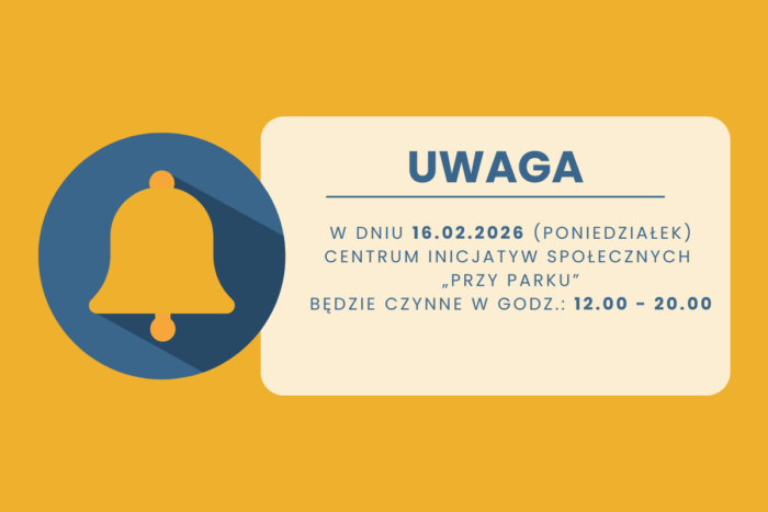 W dniu 16 lutego 2026 r. (poniedziałek) – Centrum Inicjatyw Społecznych „Przy parku” – Filia Domu Kultury Uśmiech w Ożarowie Maz. będzie czynne w godz: 12:00-20:00