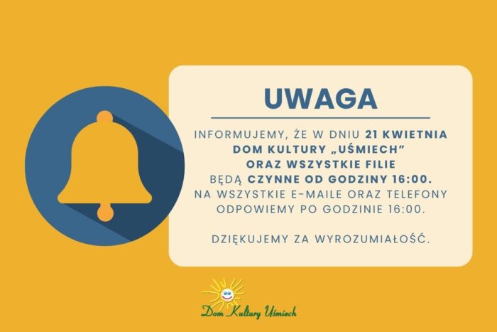 Informujemy, że w dniu 21 kwietnia Dom Kultury „Uśmiech” oraz wszystkie Filie będą czynne od godziny 16:00.