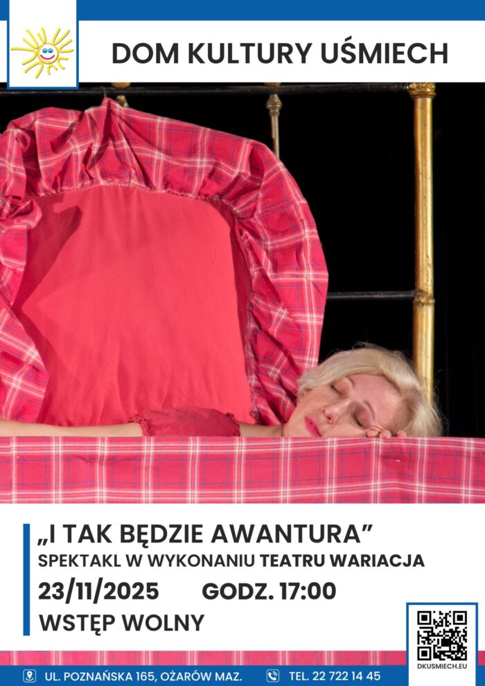 „I tak będzie awantura” – spektakl dla dorosłych | Ożarów Maz. 29 października, 2025 Udostępnij Wyślij za pomocą e-mail Zapraszamy na spektakl dla dorosłych pt. „I tak będzie awantura” w wykonaniu Teatru Wariacja na deskach sceny widowiskowej. KIEDY: 23 listopada 2025, godzina 17:00 GDZIE: Dom Kultury Uśmiech w Ożarowie Mazowieckim WSTĘP WOLNY!