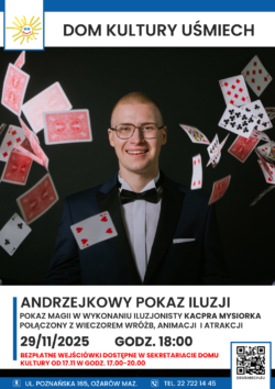 Zapraszamy na Bal Andrzejkowy w filii Józefów! Będą zabawy z woskiem i wróżbami, a także animacje i wspólne tańce. KIEDY: 23 listopada 2025, godzina 16.00 GDZIE: Filia Domu Kultury „Uśmiech” w Józefowie WSTĘP WOLNY!