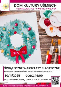 Warsztaty plastyczne dla dzieci pt. „Choinka pełna prezentów” Zapraszamy wszystkie dzieci na wyjątkowe, świąteczne warsztaty plastyczne pełne magii i kreatywnej zabawy!Każdy uczestnik stworzy swoją własną, niepowtarzalną choinkę, wykorzystując różne techniki plastyczne.Na zakończenie odbędzie się mini wystawa prac, podczas której zaprezentujemy wszystkie dzieła sztuki. KIEDY: 30 listopada 2025, godz. 16:00–18:00 GDZIE: Filia Domu Kultury „Uśmiech” Macierzyszu