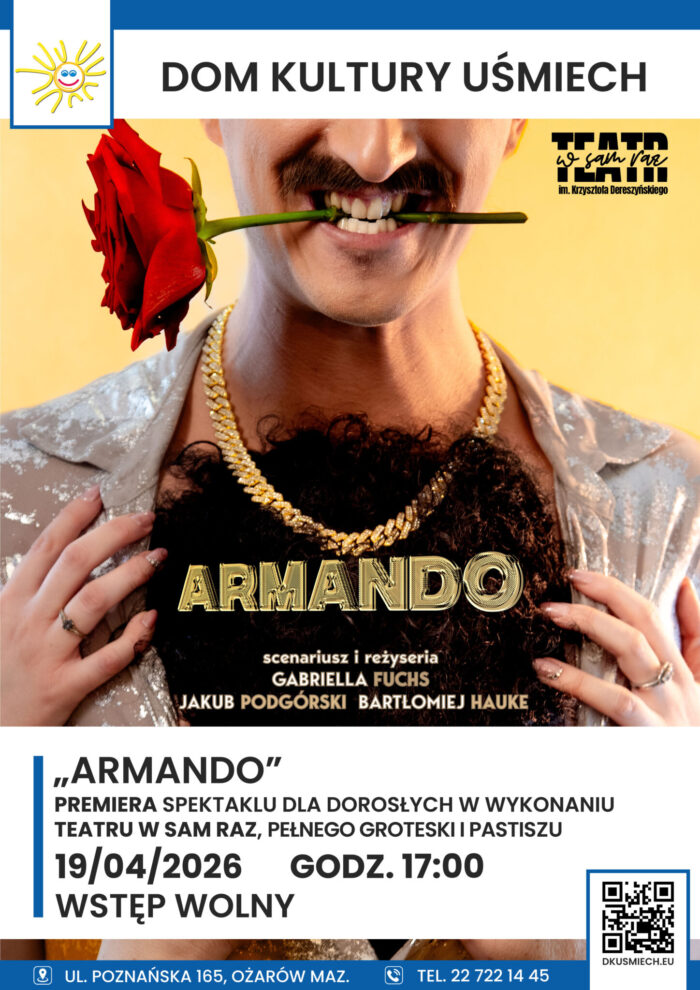 Czeka nas nie lada gratka – premiera spektaklu, który zaciera granice między farsą, groteską i pastiszem, a przy tym – porusza serca! Rezerwujcie datę i dołączajcie do nas na premierę “Armando” w wykonaniu Teatru W Sam Raz.