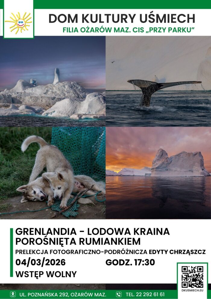 Prelekcja fotograficzno-podróżnicza Edyty Chrząszcz o Grenlandii. Będzie to opowieść nietuzinkowa, inna niż wszystkie. Grenlandia nie schodzi teraz z pierwszych stron gazet, a Edyta Chrząszcz pokaże jak tam jest naprawdę.