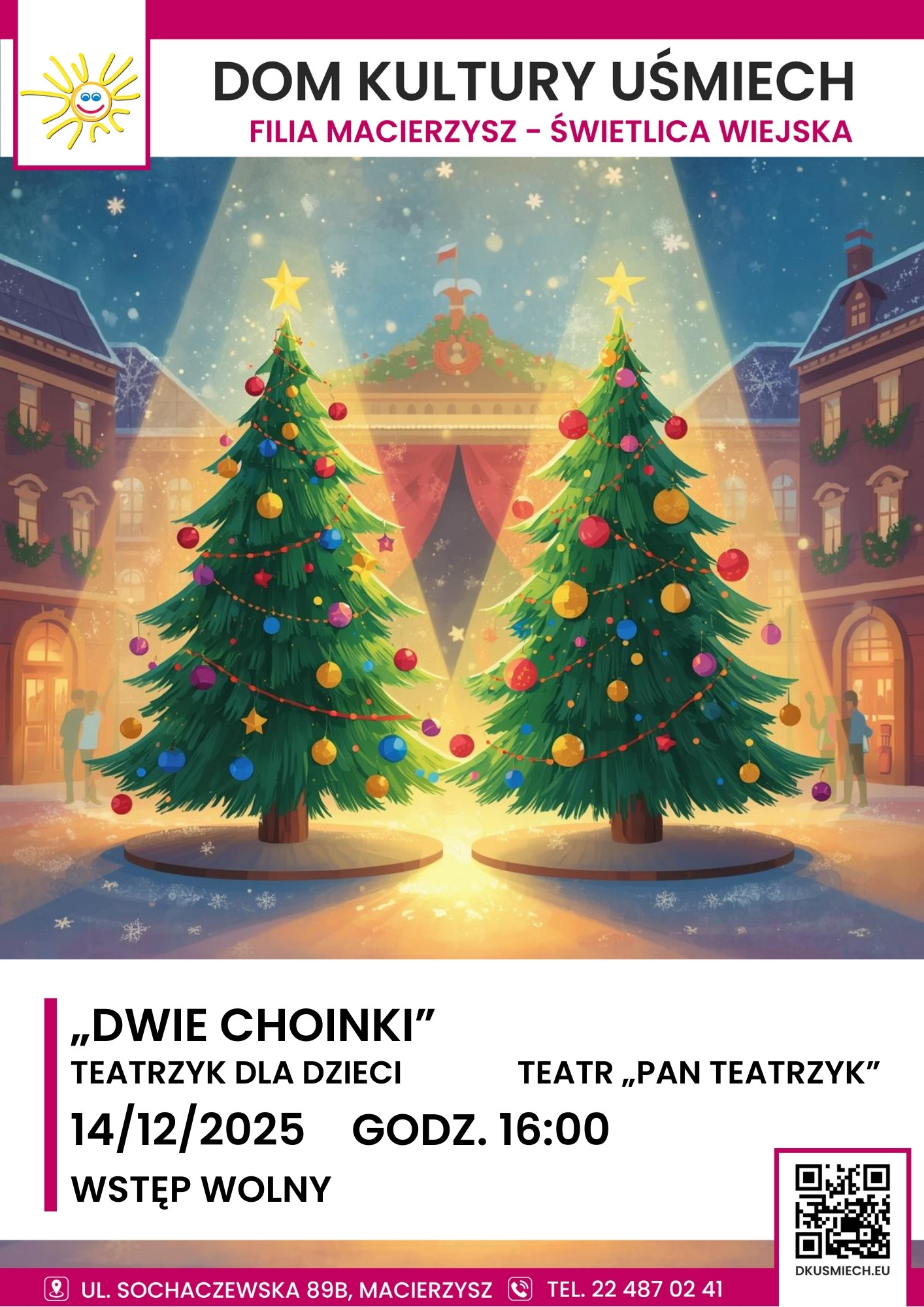 Zapraszamy wszystkie dzieci na spektakl teatralny „Dwie choinki” w wykonaniu Teatru Pan Teatrzyk. Czeka nas opowieść o dwóch choinkach, które pokłóciły się o to, która jest najładniejsza. Czy wspólnie uda się rozwiązać konflikt i uratować Święta? Przekonamy się o tym już w najbliższą niedzielę.