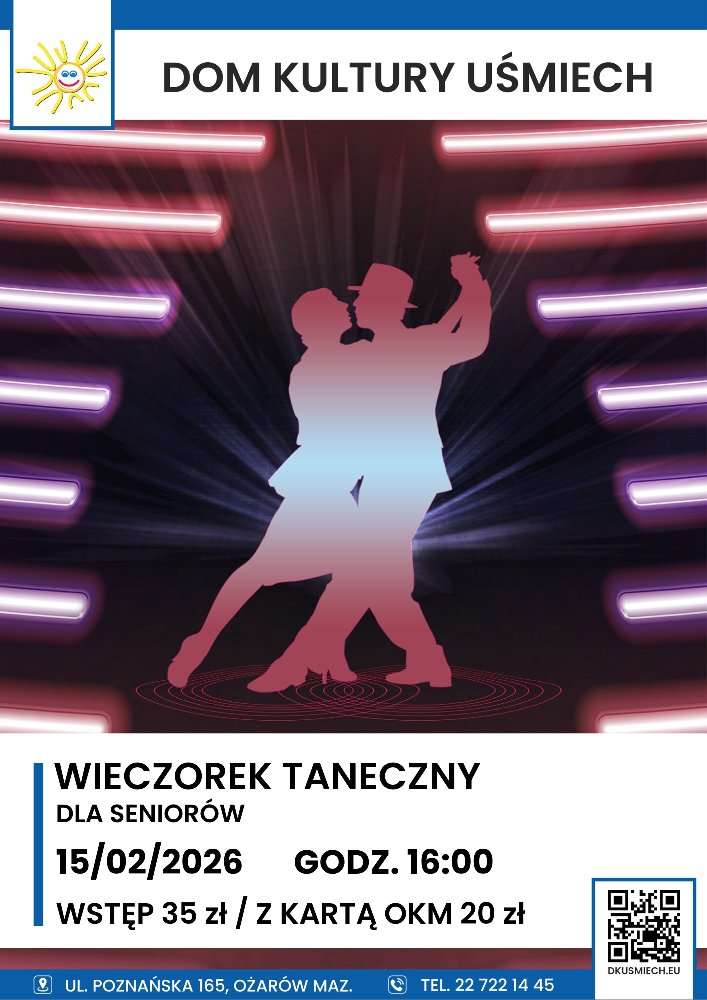 Wieczorek taneczny dla seniorów 15.02.2026 | Ożarów Maz. 15 stycznia, 2026 Udostępnij Wyślij za pomocą e-mail Wieczorek Taneczny dla seniorów w Domu Kultury Uśmiech! KIEDY: niedziela, 15.02.2026, start: godz. 16:00GDZIE: Dom Kultury Uśmiech w Ożarowie Mazowieckim UWAGA: Wstęp płatny! Bilety do nabycia przy wejściu: 35 zł / 20 zł z kartą OKM. Płatność gotówką.